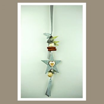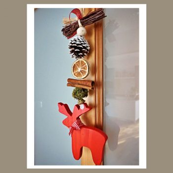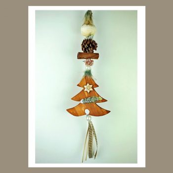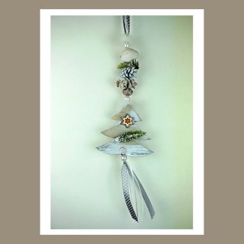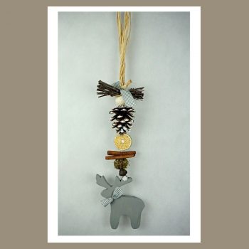 To ręcznie robiona zawieszka, łącząca naturalne elementy – szyszkę, cynamon, gałązkę świerku – z eleganckimi detalami, takimi jak satynowa wstążka, perełki i mini ozdoby świąteczne.