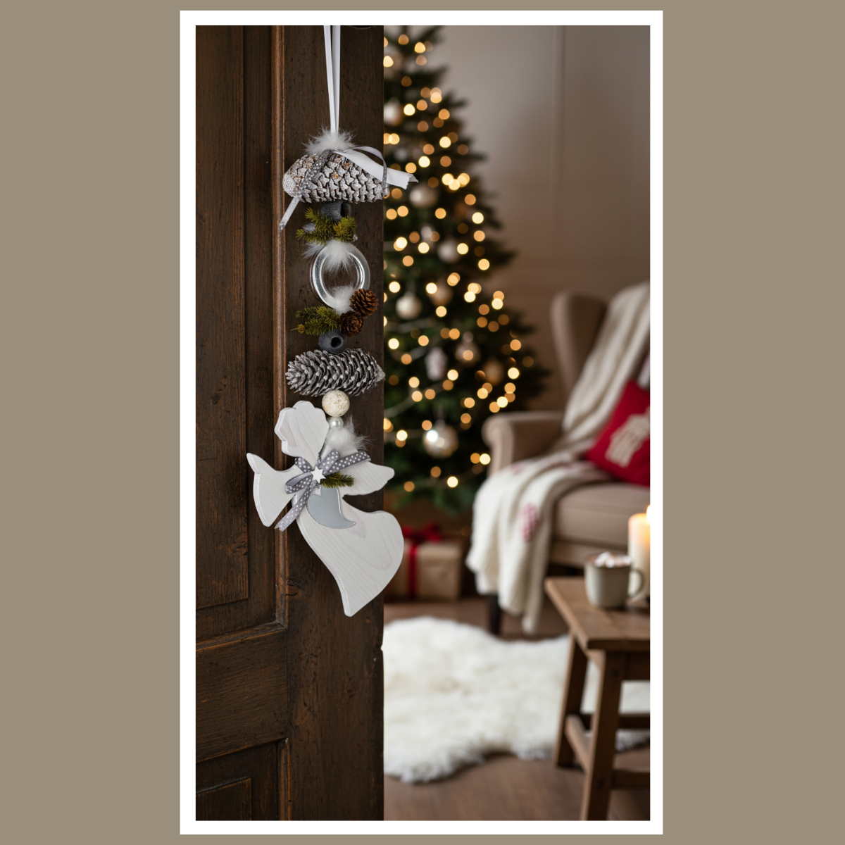Wprowadź do swojego wnętrza świąteczną harmonię i blask z naszą wyjątkową dekoracją „Anioł z lustrzanym sercem”.