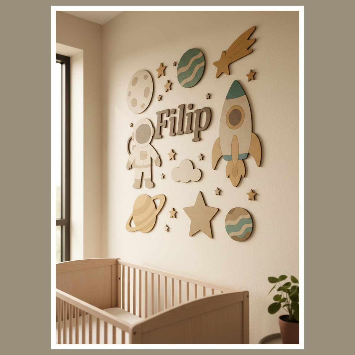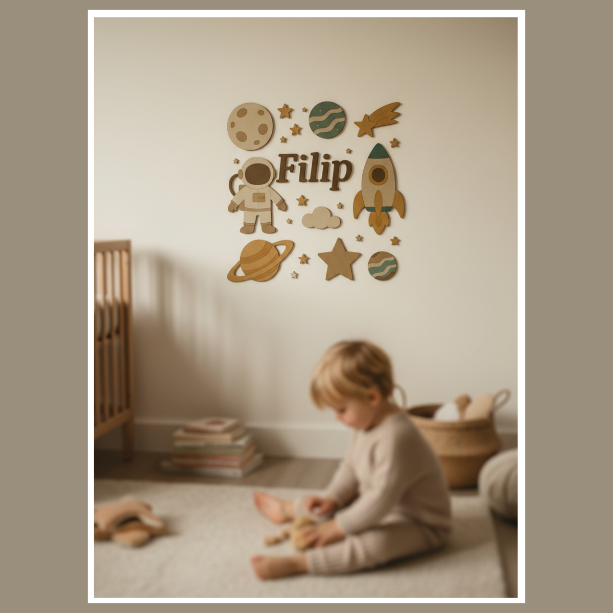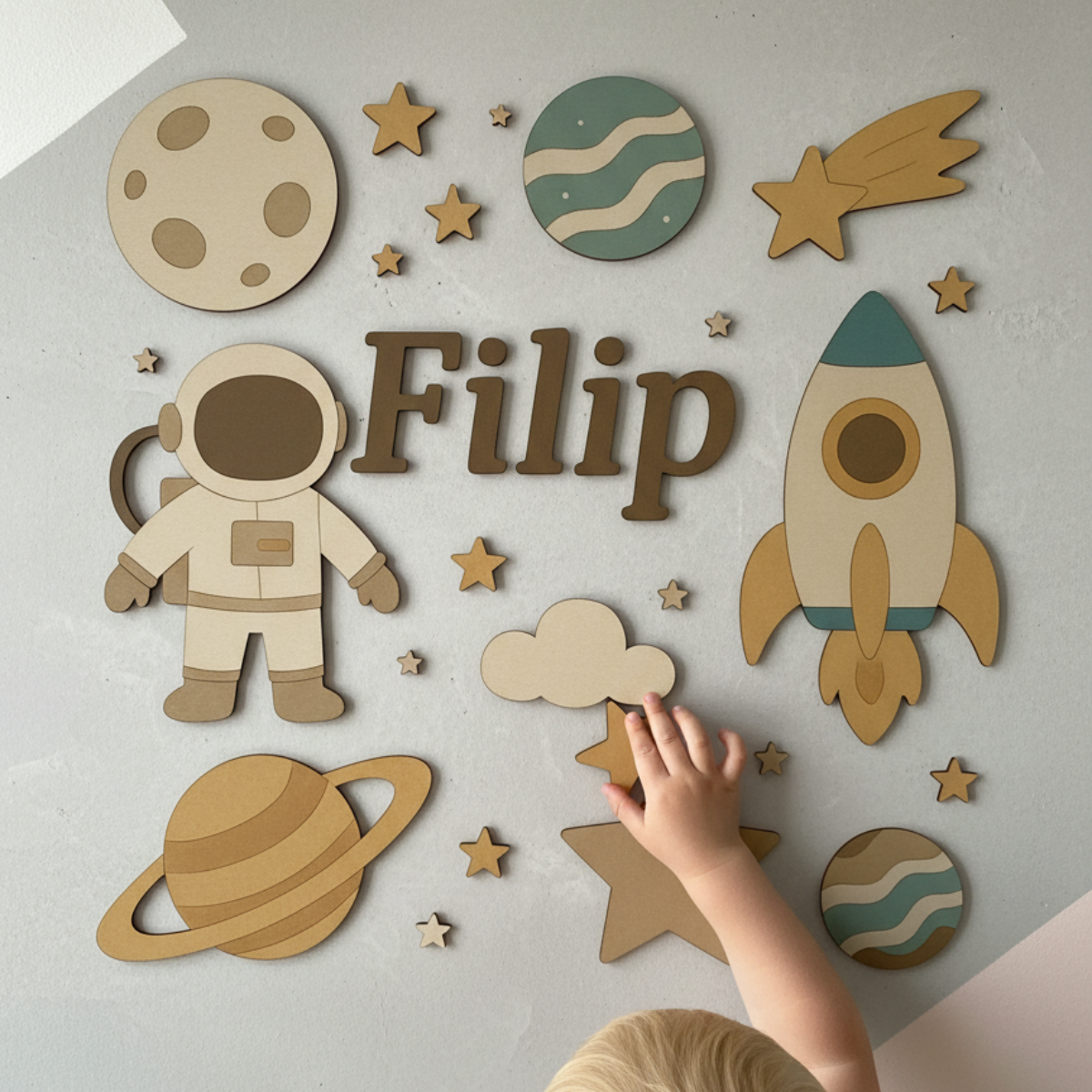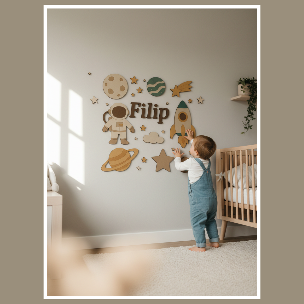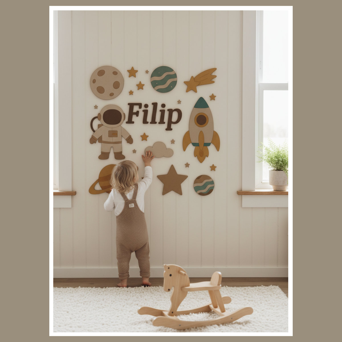 W komplecie otrzymujesz drewniane elementy tworzące spójną kompozycję: kosmiczne motywy oraz personalizowane imię dziecka. Dzięki temu możesz ułożyć dekoracje na ścianie po swojemu – bardziej symetrycznie albo luźniej, “rozsypane” po przestrzeni. To świetne rozwiązanie nad łóżeczko, komodę lub w kąciku zabaw, ponieważ całość jest lekka i bezpieczna.