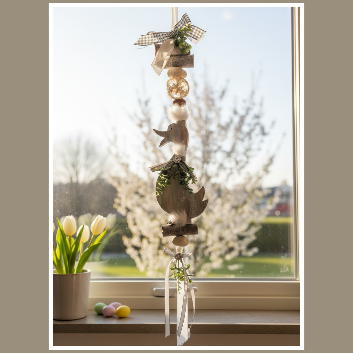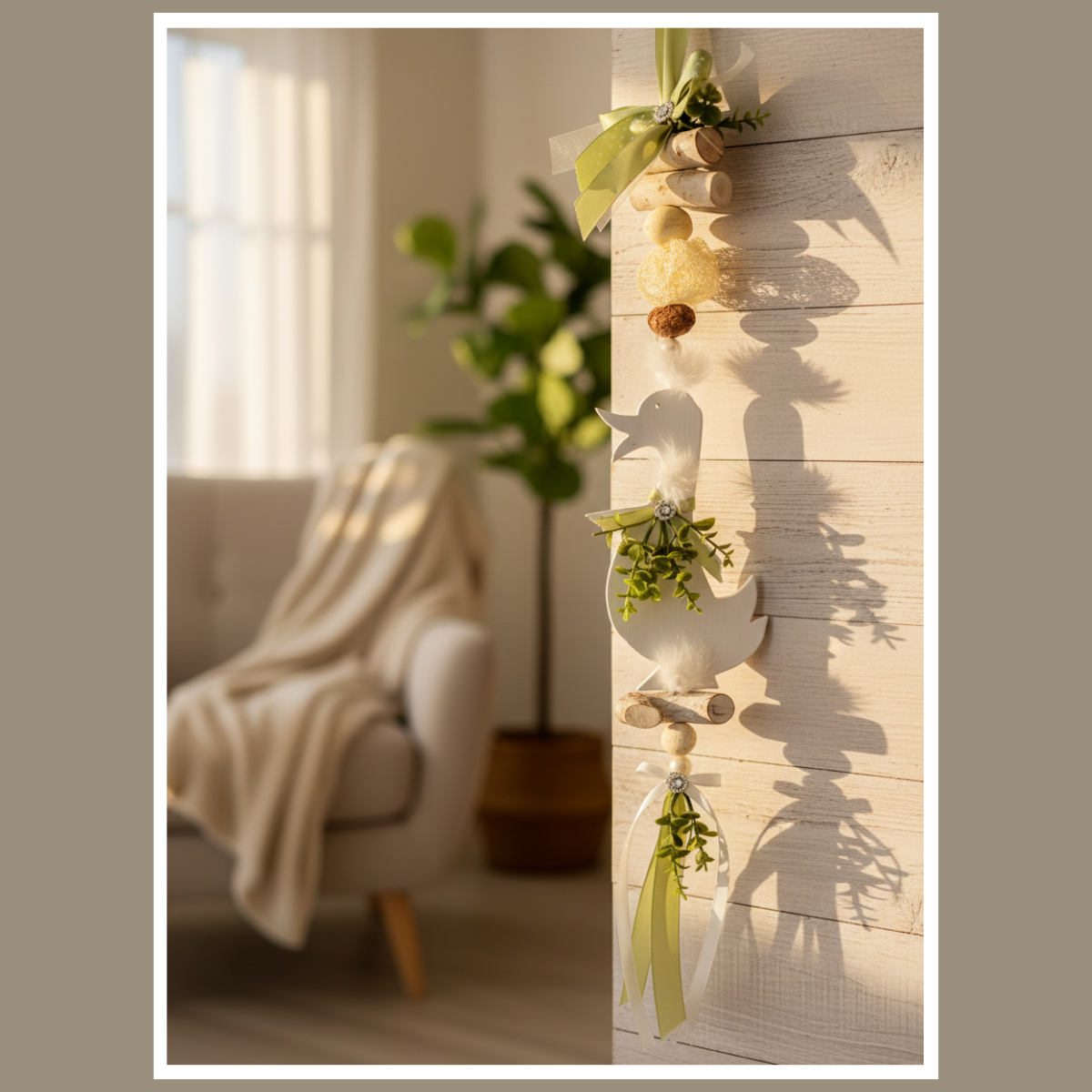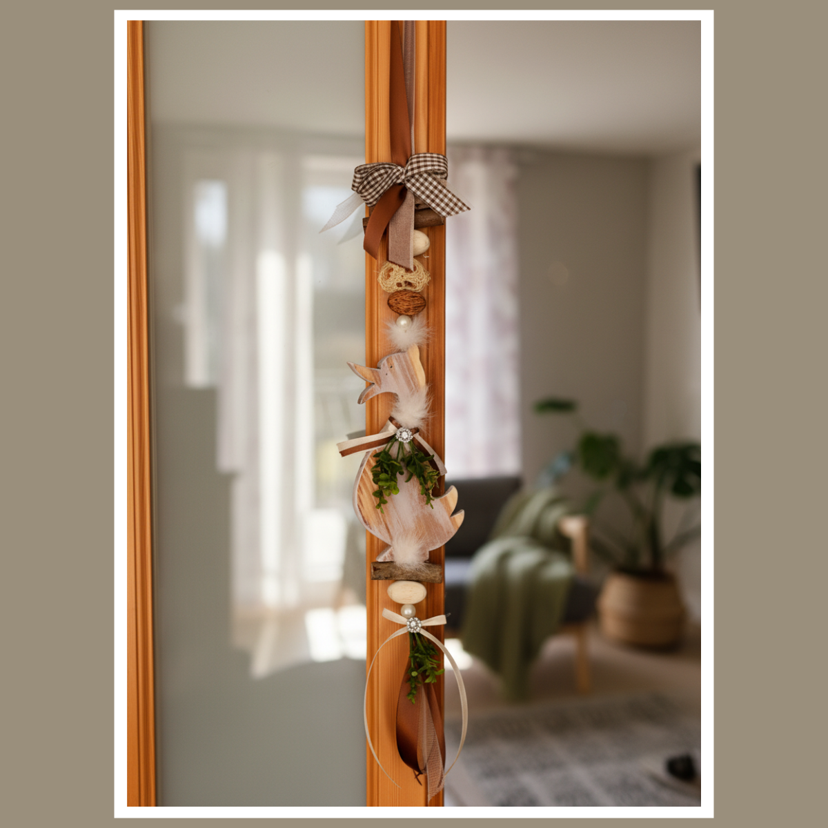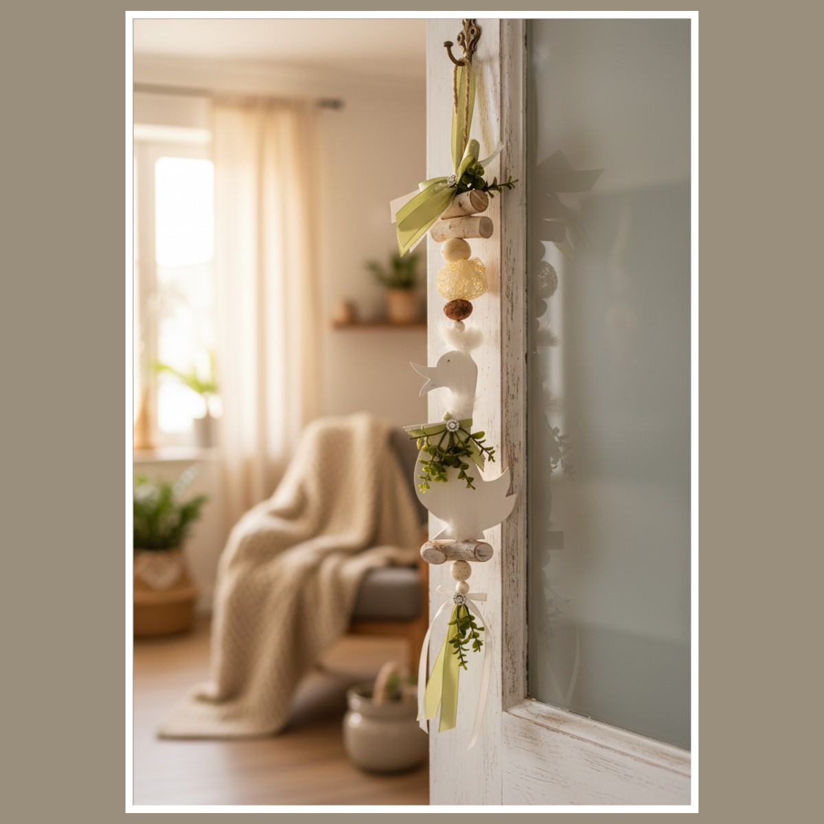 Całość składa się z drewnianej gęsi oraz elementów ułożonych pionowo: koralików, delikatnych piórek, wstążek i zielonych akcentów. Dzięki temu dekoracja wygląda lekko i harmonijnie, a jednocześnie przyciąga wzrok detalem. Pasuje do wnętrz boho, rustykalnych, skandynawskich i klasycznych, zwłaszcza tam, gdzie dominują jasne tkaniny, drewno i naturalne dodatki.