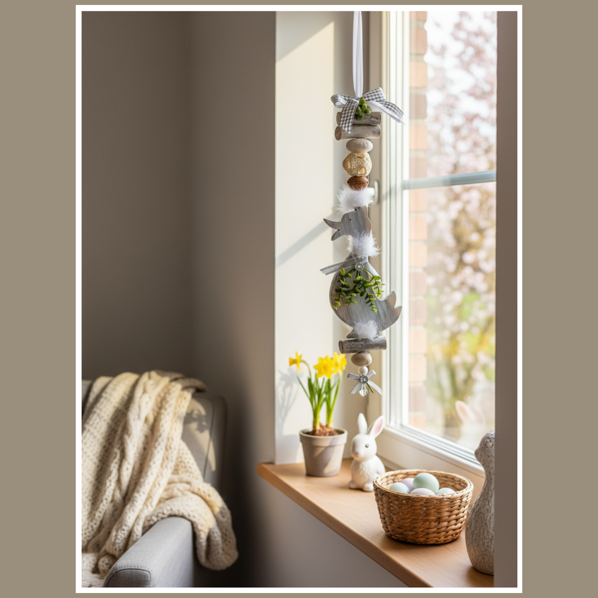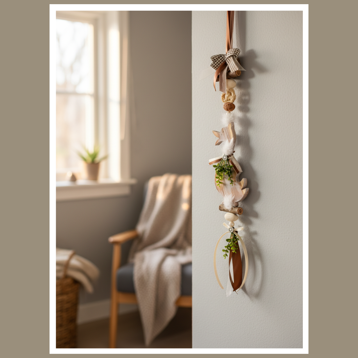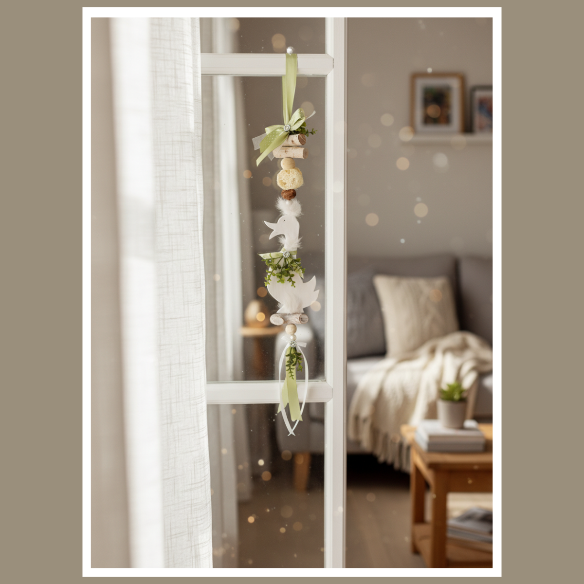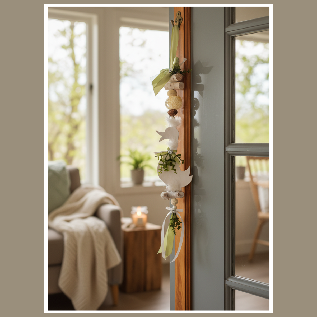 Całość składa się z drewnianej gęsi oraz elementów ułożonych pionowo: koralików, delikatnych piórek, wstążek i zielonych akcentów. Dzięki temu dekoracja wygląda lekko i harmonijnie, a jednocześnie przyciąga wzrok detalem. Pasuje do wnętrz boho, rustykalnych, skandynawskich i klasycznych, zwłaszcza tam, gdzie dominują jasne tkaniny, drewno i naturalne dodatki.
