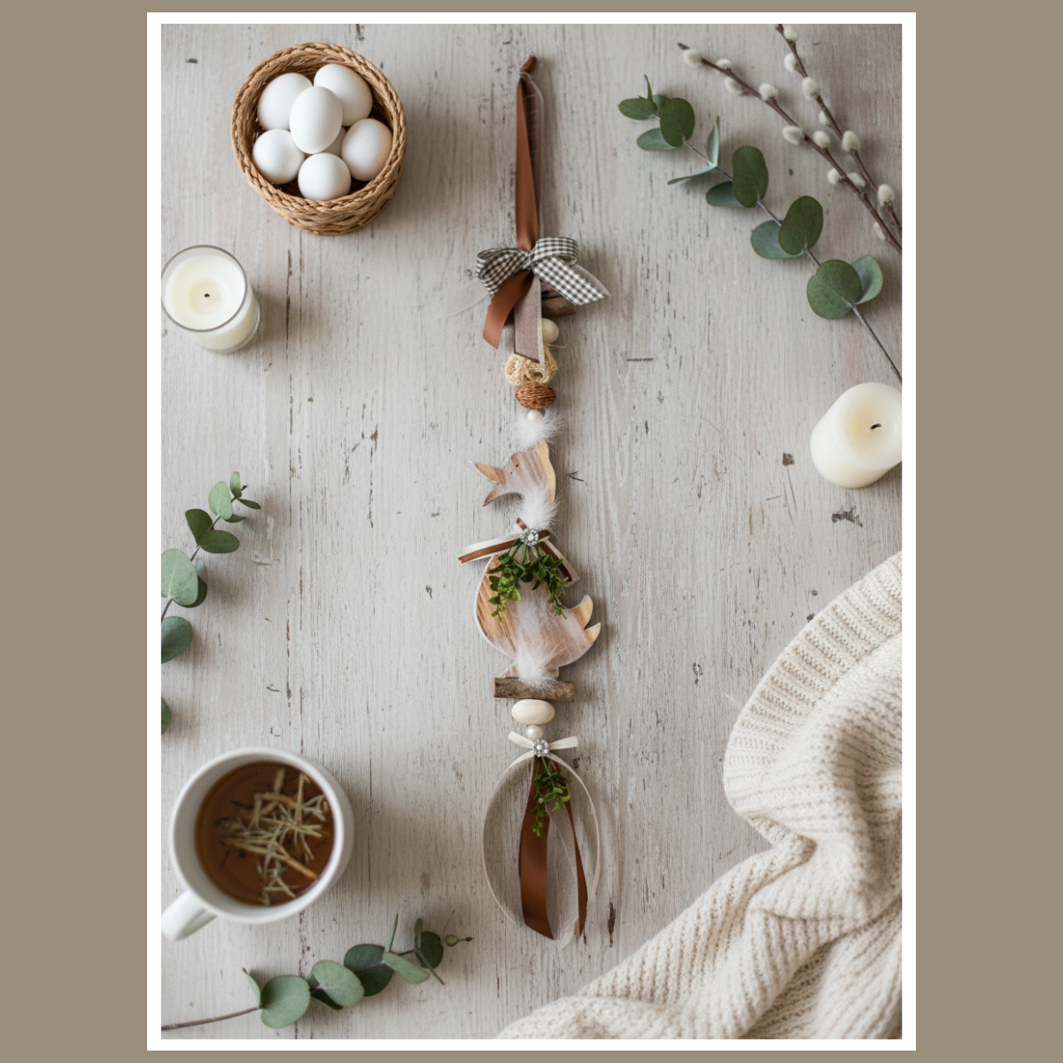 Dekoracja wielkanocna wisząca z gęsią to wiosenna ozdoba, która od razu wprowadza do wnętrza przytulny, naturalny klimat. Wykonana z drewna i starannie dobranych dodatków, pięknie prezentuje się na drzwiach, w oknie lub na ścianie. To właśnie ten typ dekoracji jest naszym znakiem rozpoznawczym z jarmarków – we Wrocławiu kojarzony głównie z wersjami zimowymi, ale technika i charakter wykonania są dokładnie te same.