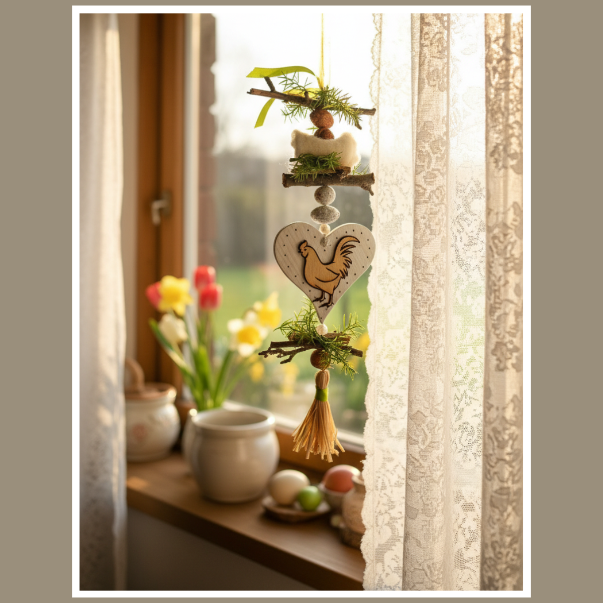 Szukasz dekoracji, która doda wnętrzu ciepła i będzie pasować nie tylko na jeden sezon? Dekoracja wisząca z kogucikiem to naturalna ozdoba, która świetnie wygląda od razu po zawieszeniu. Drewniane serce z motywem koguta łączy się z gałązkami, zielenią, koralikami oraz chwostem, dlatego całość prezentuje się przytulnie i bardzo „domowo”.