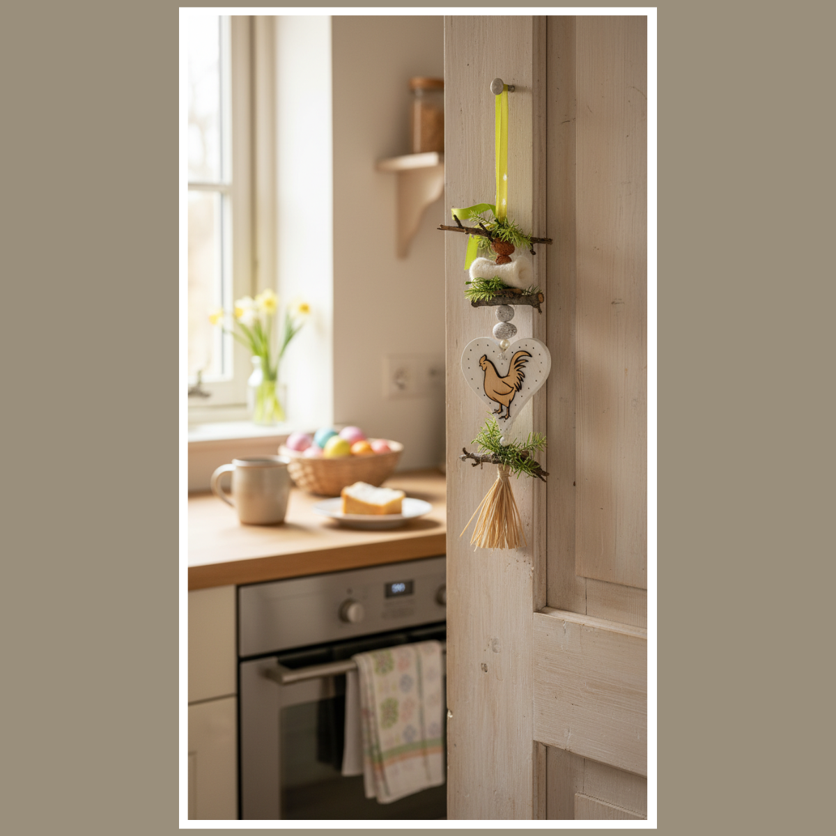 W centrum znajduje się drewniane serce z kogucikiem, a całość dopełniają naturalne dodatki: gałązki, zieleń, koraliki i chwost. Dzięki temu dekoracja nie jest „przerysowana”, tylko spójna, lekka i estetyczna. Dodatkowym atutem jest ręczne wykonanie – każdy egzemplarz może mieć drobne różnice w ułożeniu dodatków, ale styl pozostaje taki sam.