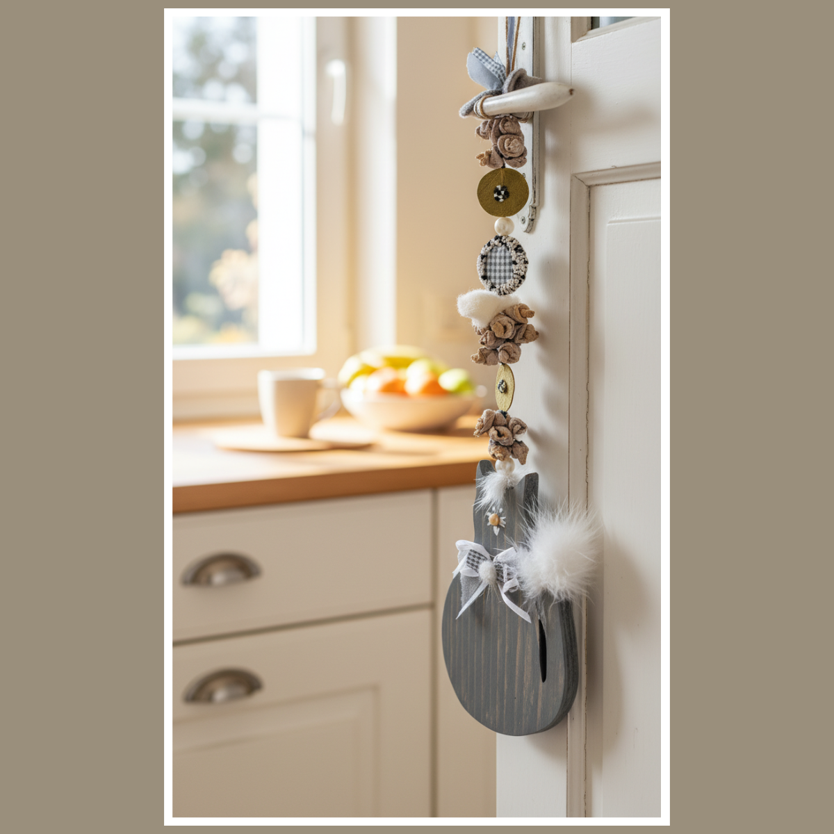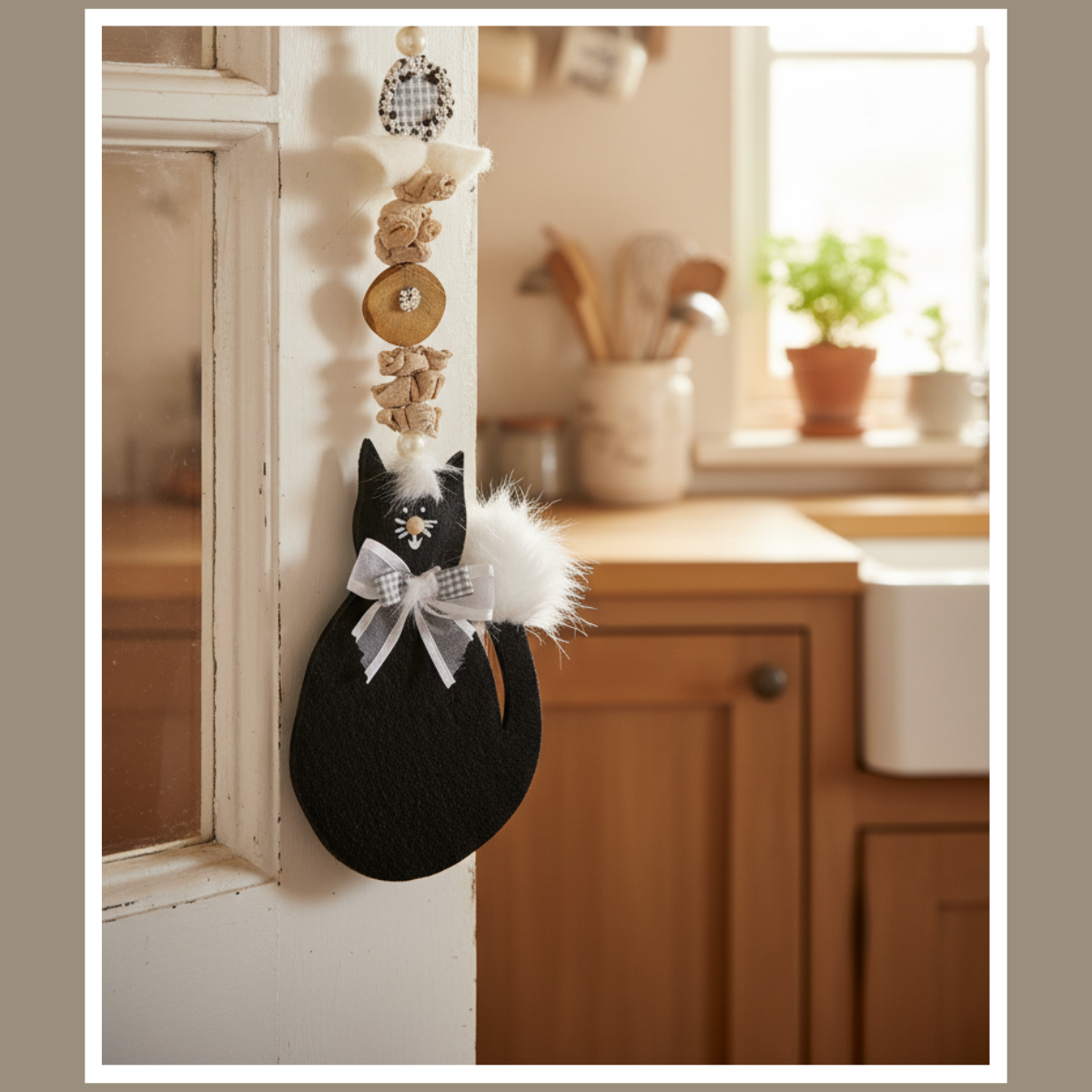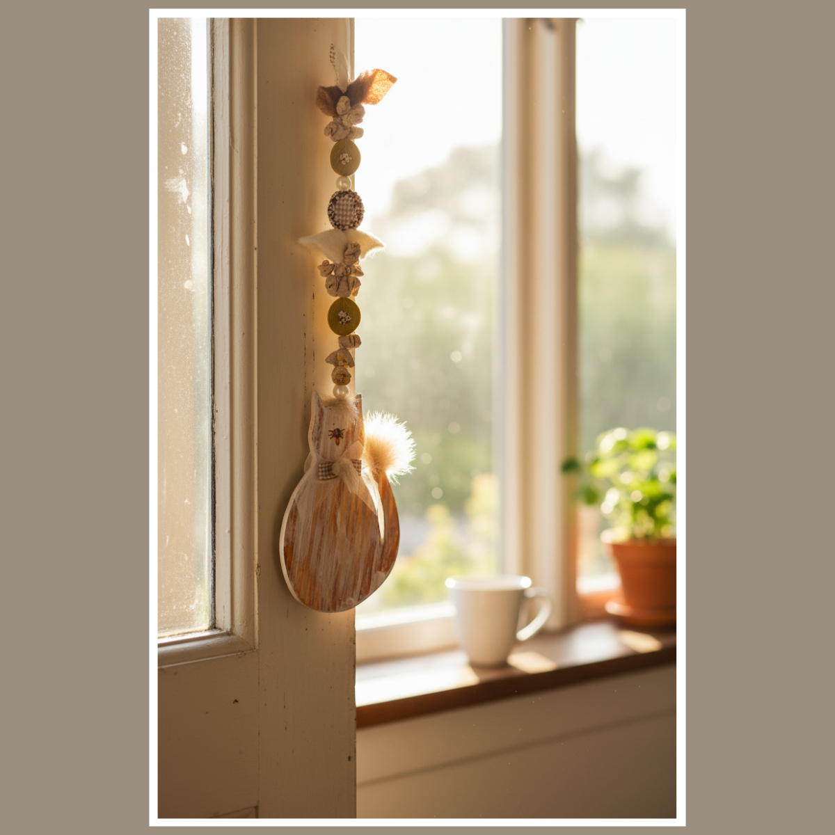 Dekoracja wisząca kot z pomponem to urocza, drewniana ozdoba w naturalnym stylu. Ma miękkie detale i spokojną kolorystykę – kolor wybierzesz w wariantach.