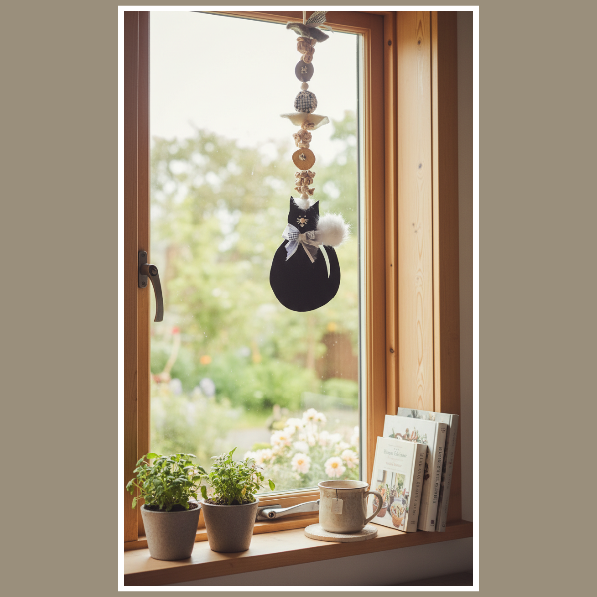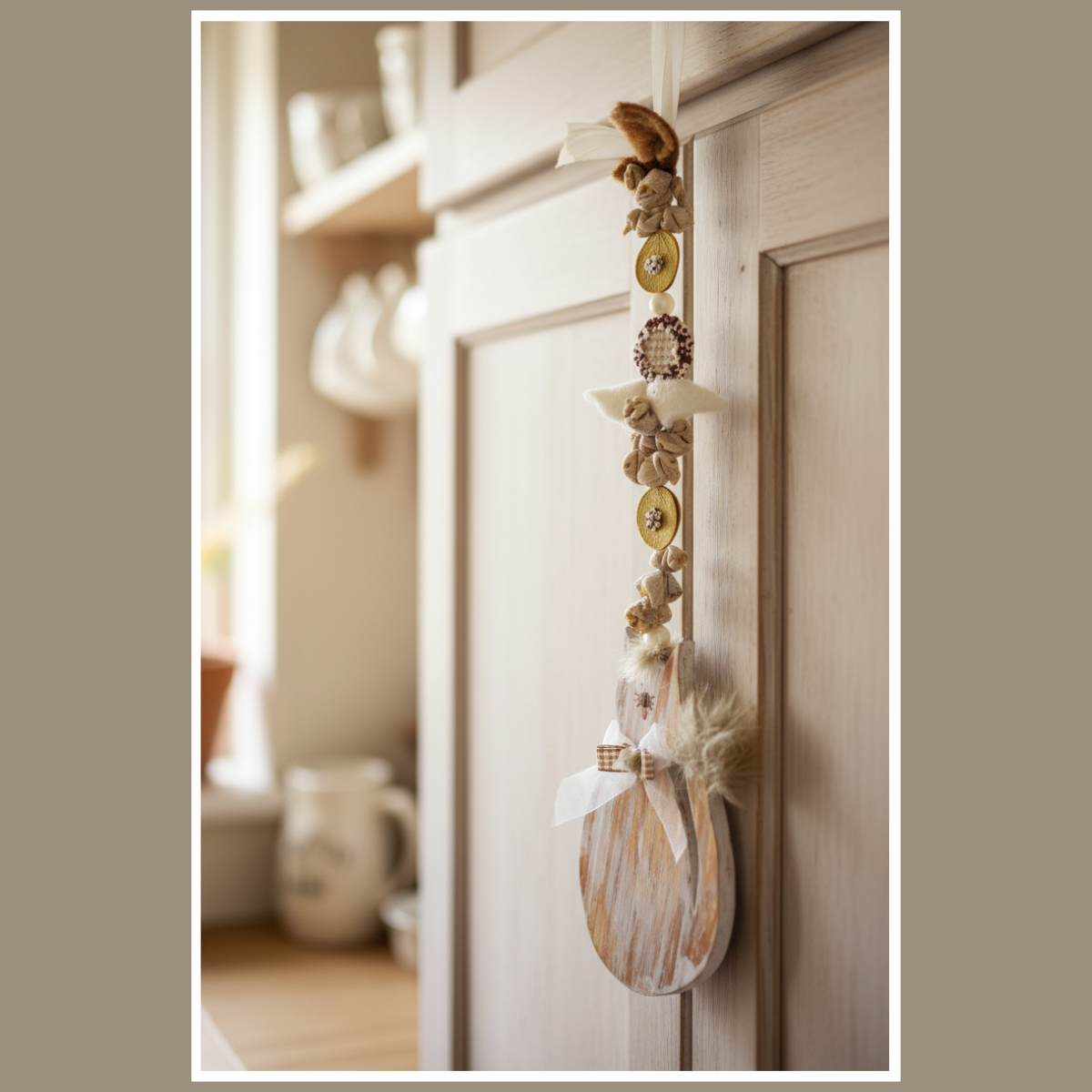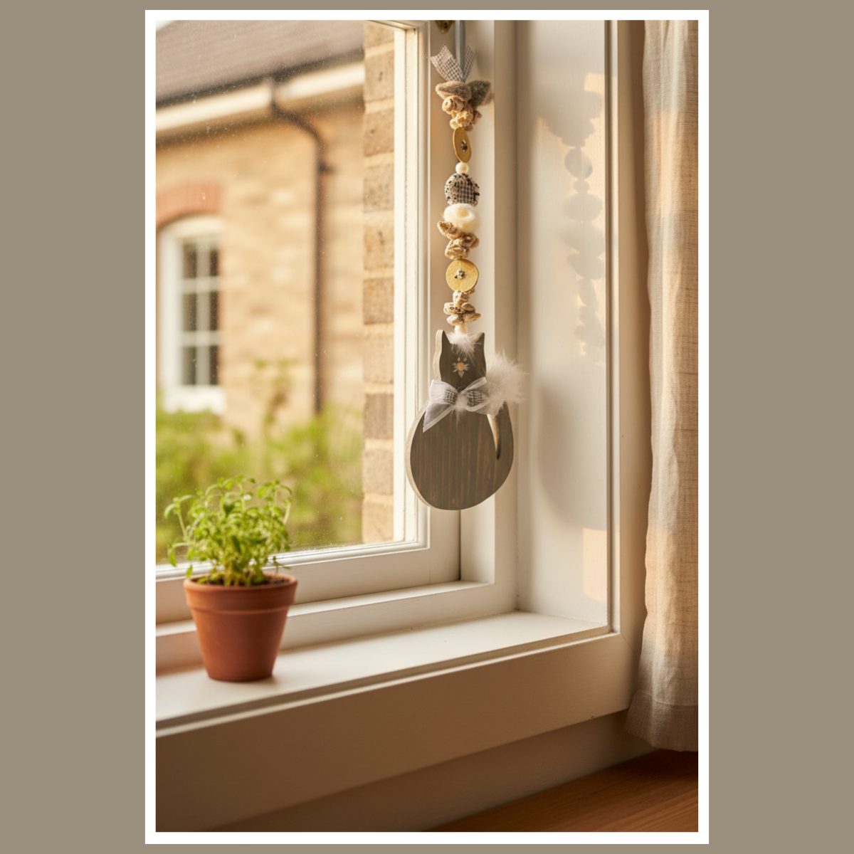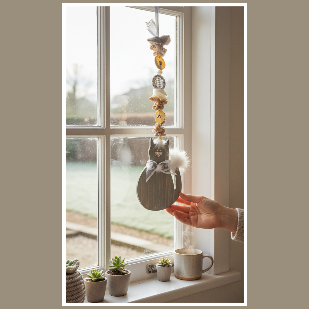 Dekoracja wisząca kot z pomponem to urocza, drewniana ozdoba w naturalnym stylu. Ma miękkie detale i spokojną kolorystykę – kolor wybierzesz w wariantach.