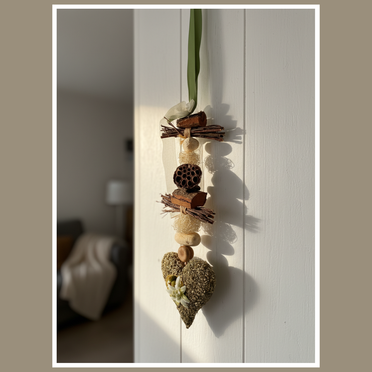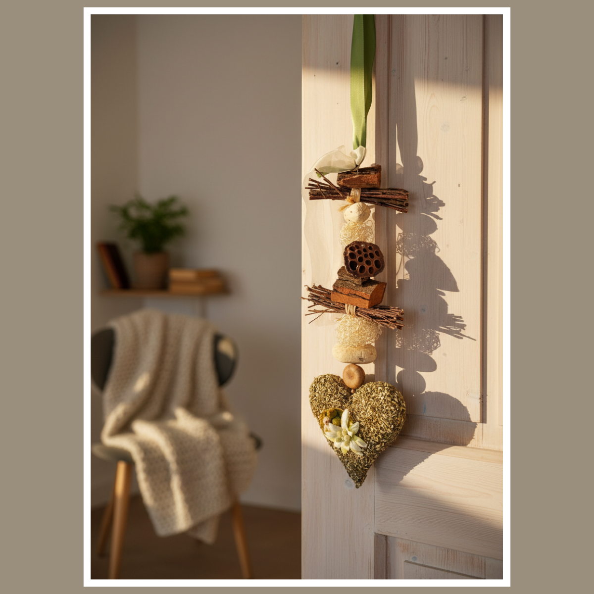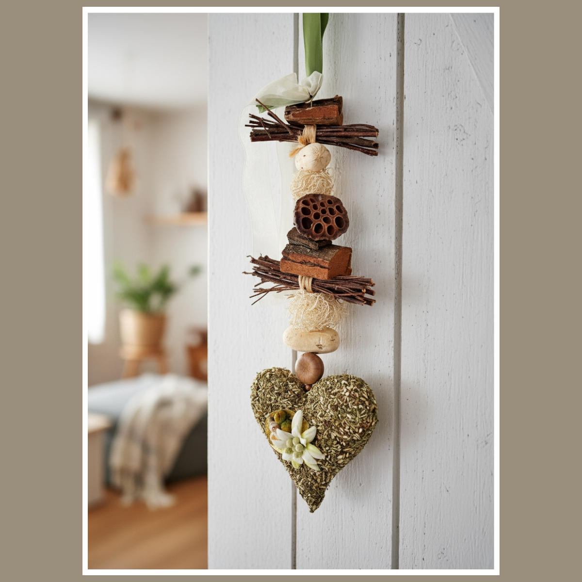 Dekoracja wisząca serce z ziół z szarotką to ręcznie wykonana, naturalna ozdoba całoroczna. Subtelna i lekka – pięknie wygląda na drzwiach, w oknie lub na ścianie.