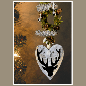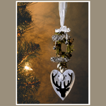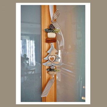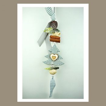 Dekoracja została wykonana ręcznie z dbałością o każdy szczegół – u góry znajduje się ozdobna szyszka z kokardą, świąteczne dodatki z cynamonem i czerwonym jabłuszkiem, a całość wieńczy urocza gwiazda ozdobiona kokardą, zielenią i błyszczącymi kryształkami.