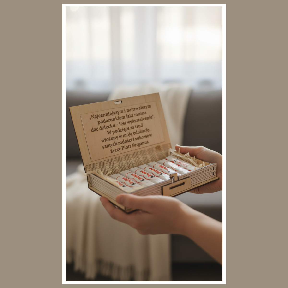 Po pierwsze, jest personalizowany. Po drugie, łączy kartkę i prezent w jednym. A na koniec zostaje na długo, bo drewno jest trwałe i estetyczne.