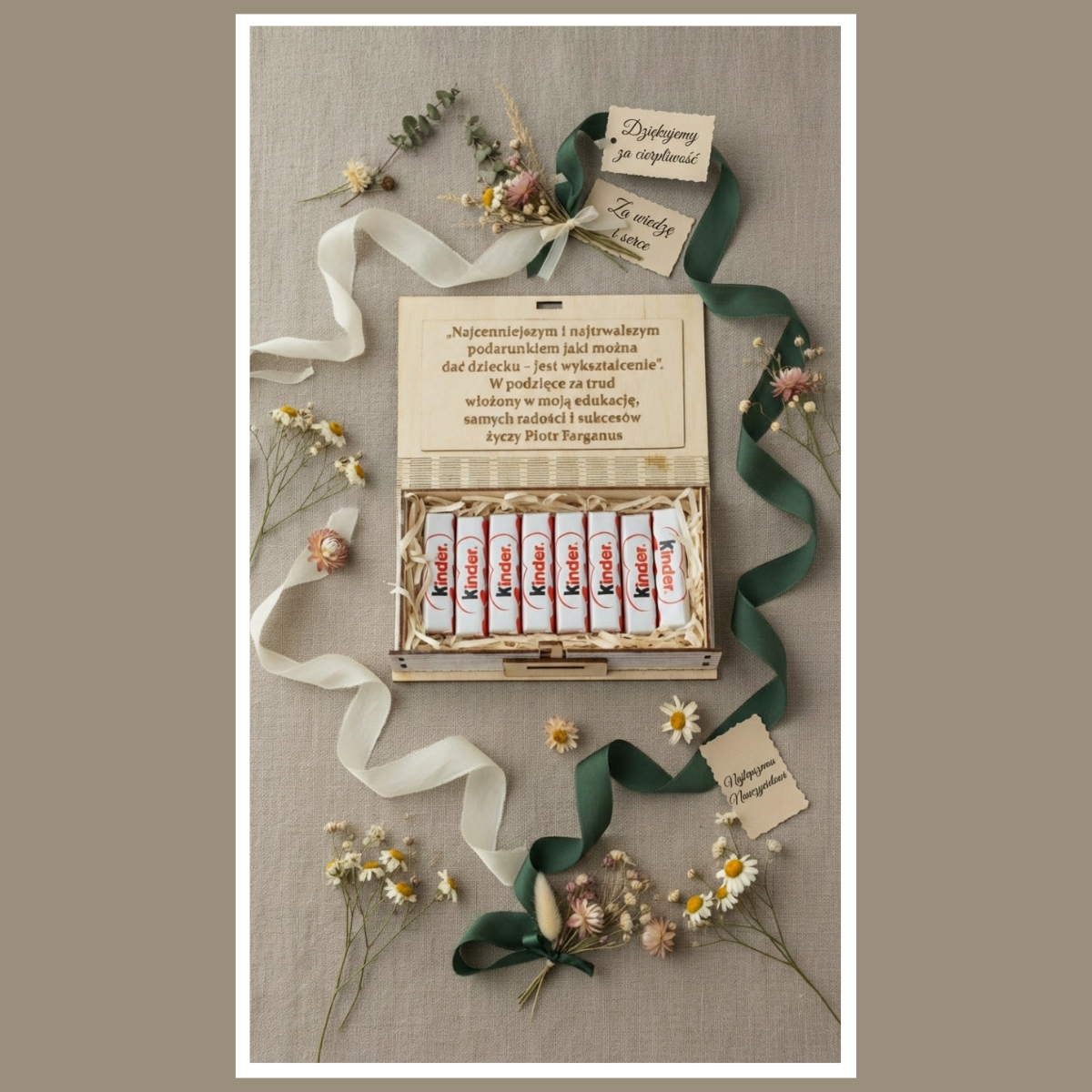 Drewniana kartka dla nauczyciela słodki upominek to eleganckie podziękowanie wykonane ze sklejki, z miejscem na słodycze oraz z personalizacją. Tekst na okładce jest tylko przykładem, dlatego możesz wybrać dowolną treść. Dodatkowo dopiszemy imię nauczyciela/nauczycielki oraz podpis (np. klasa, grupa, imiona dzieci).