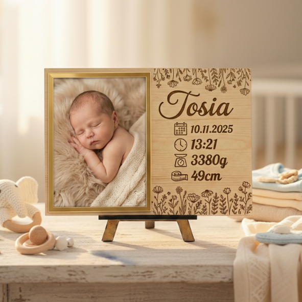 Drewniana metryczka ze zdjęciem to wyjątkowa, personalizowana pamiątka, która zatrzymuje najważniejsze emocje z dnia narodzin dziecka. To nie jest zwykła dekoracja – to wspomnienie w pięknej, trwałej formie: imię maluszka, data urodzenia, godzina, waga, wzrost oraz ulubione zdjęcie w eleganckiej oprawie. Metryczka świetnie wygląda w pokoju dziecka, na półce w salonie albo w sypialni rodziców – wszędzie tam, gdzie chcesz mieć blisko te pierwsze chwile.
