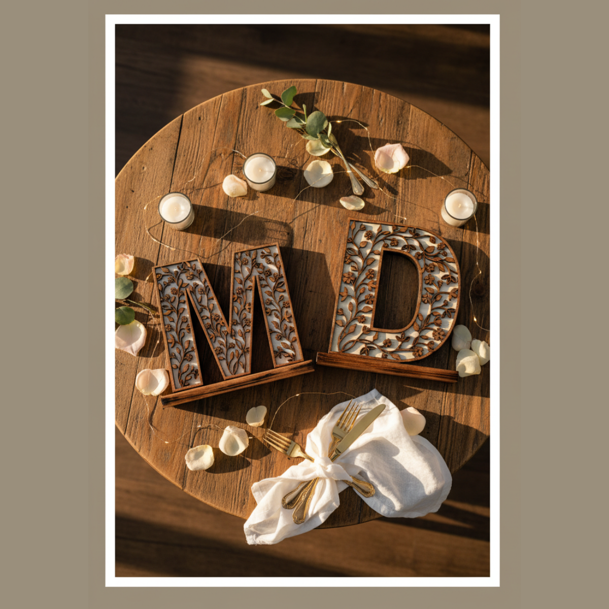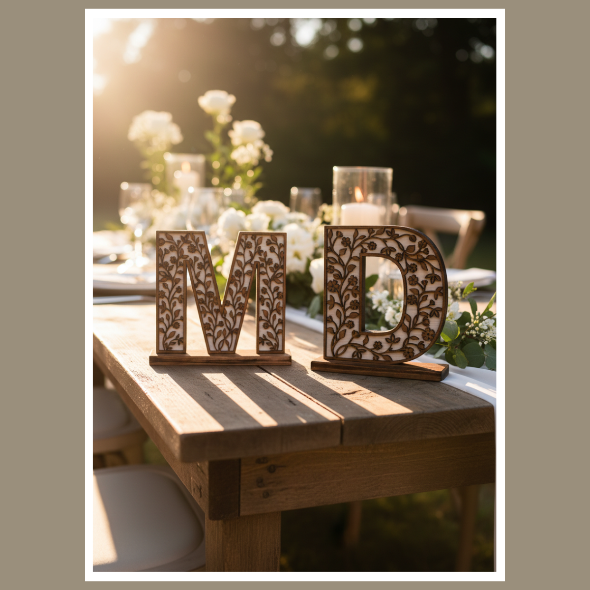 Drewniane inicjały ślubne w motywie kwiatowym to detal, który wygląda lekko i romantycznie. Wzór roślinny pięknie podkreśla naturalny charakter drewna, a jednocześnie dodaje całości elegancji. Dlatego inicjały świetnie pasują do wesel boho, rustykalnych oraz klasycznych.