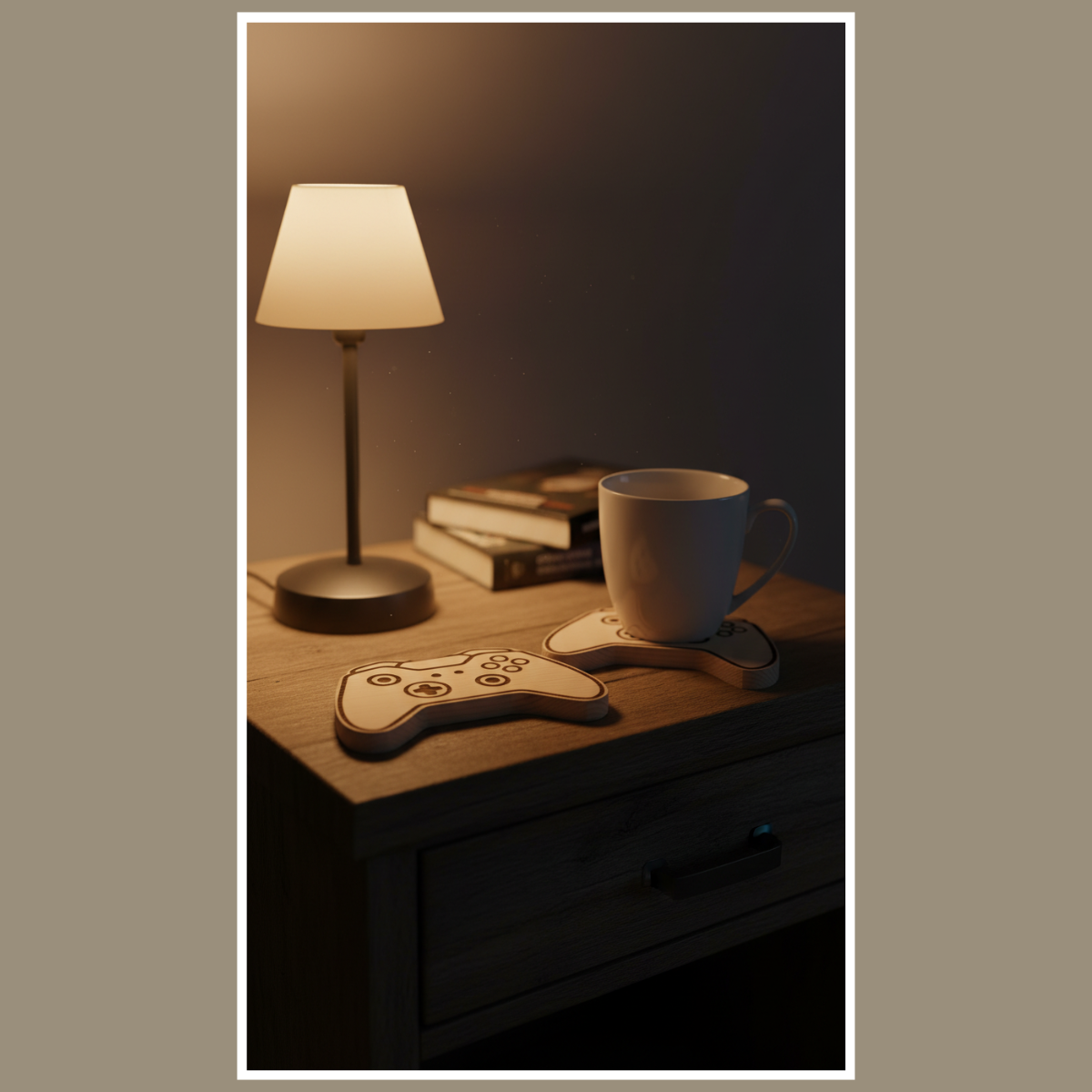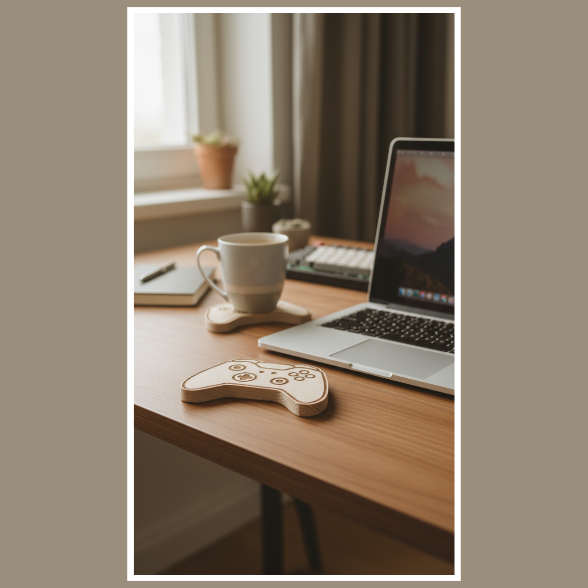 Drewniane podkładki gamingowe z motywem pada to stylowy dodatek na biurko gracza. Podkładki są wycinane i grawerowane laserowo, a następnie starannie wykańczane. Możesz kupić je pojedynczo lub w zestawie – idealne do domu, biura i jako prezent.