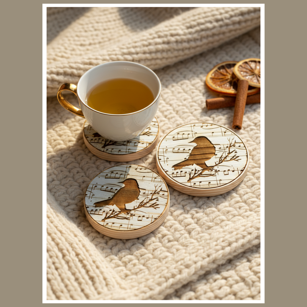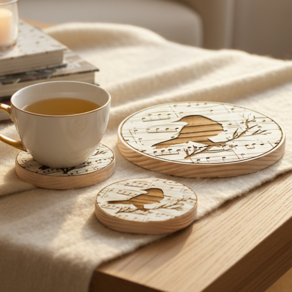 Motyw ptaszków i nut jest delikatny, dlatego podkładki pasują do wielu wnętrz. Sprawdzą się w domu, ale też w gabinecie, pracowni czy w kąciku do czytania.