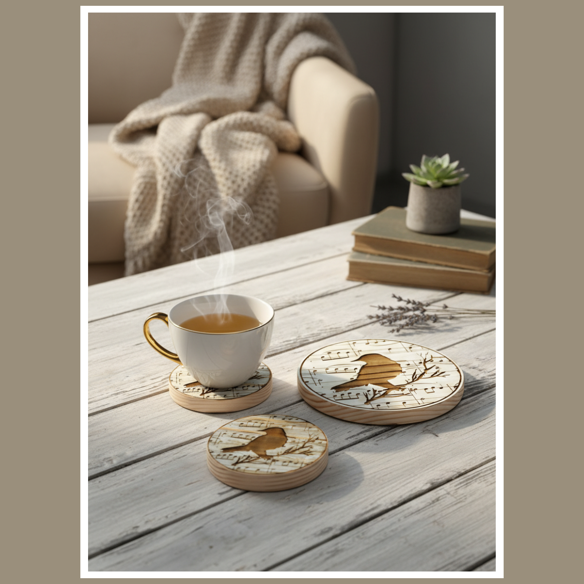 Drewniane podkładki pod kubek z motywem ptaszków na tle nut to połączenie funkcji i dekoracji. Są lekkie, a przy tym solidne, dlatego świetnie sprawdzają się na co dzień. Co więcej, pięknie wyglądają w salonie, kuchni i jadalni, a także pasują do aranżacji boho, rustykalnych i klasycznych.