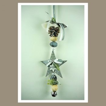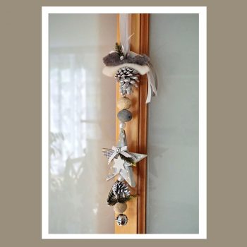 Dekoracja jest wykonana z wysokiej jakości drewna, zdobiona naturalnymi dodatkami i detalami w stylu handmade.