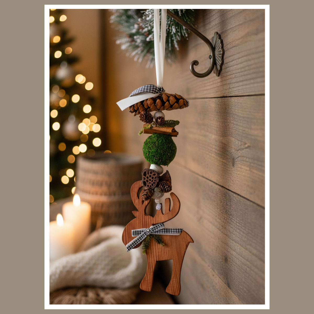 To wyjątkowa dekoracja wykonana z naturalnych materiałów – drewna, szyszek, mchu i cynamonu, ozdobiona wstążką w kratkę i delikatnymi dodatkami świątecznymi.