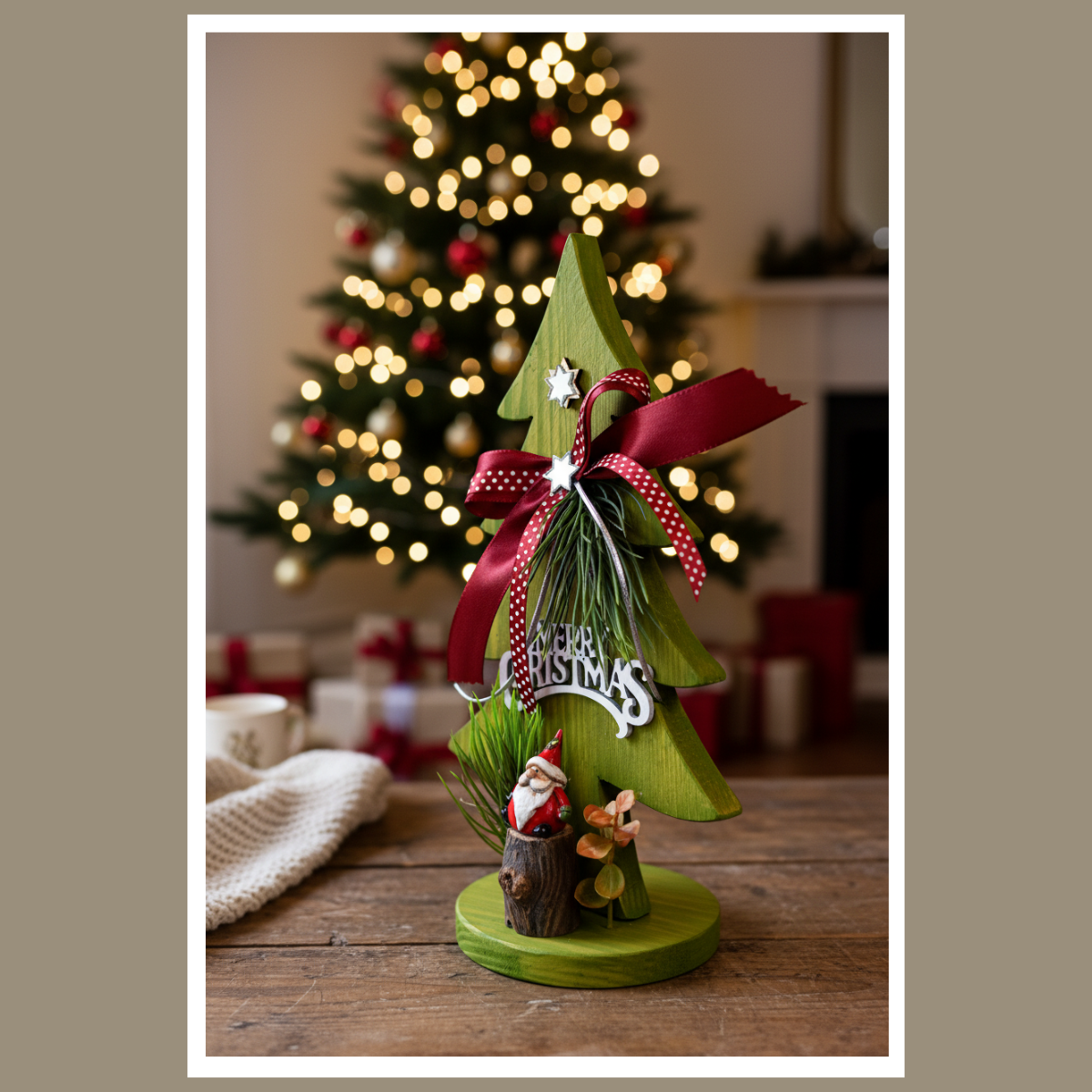 Każda choinka została wykonana z naturalnego drewna i ozdobiona starannie dobranymi detalami: kokardami, gałązkami iglastymi, figurkami Mikołajków, skrzatów czy bałwanków – dzięki czemu każda sztuka jest jedyna w swoim rodzaju.