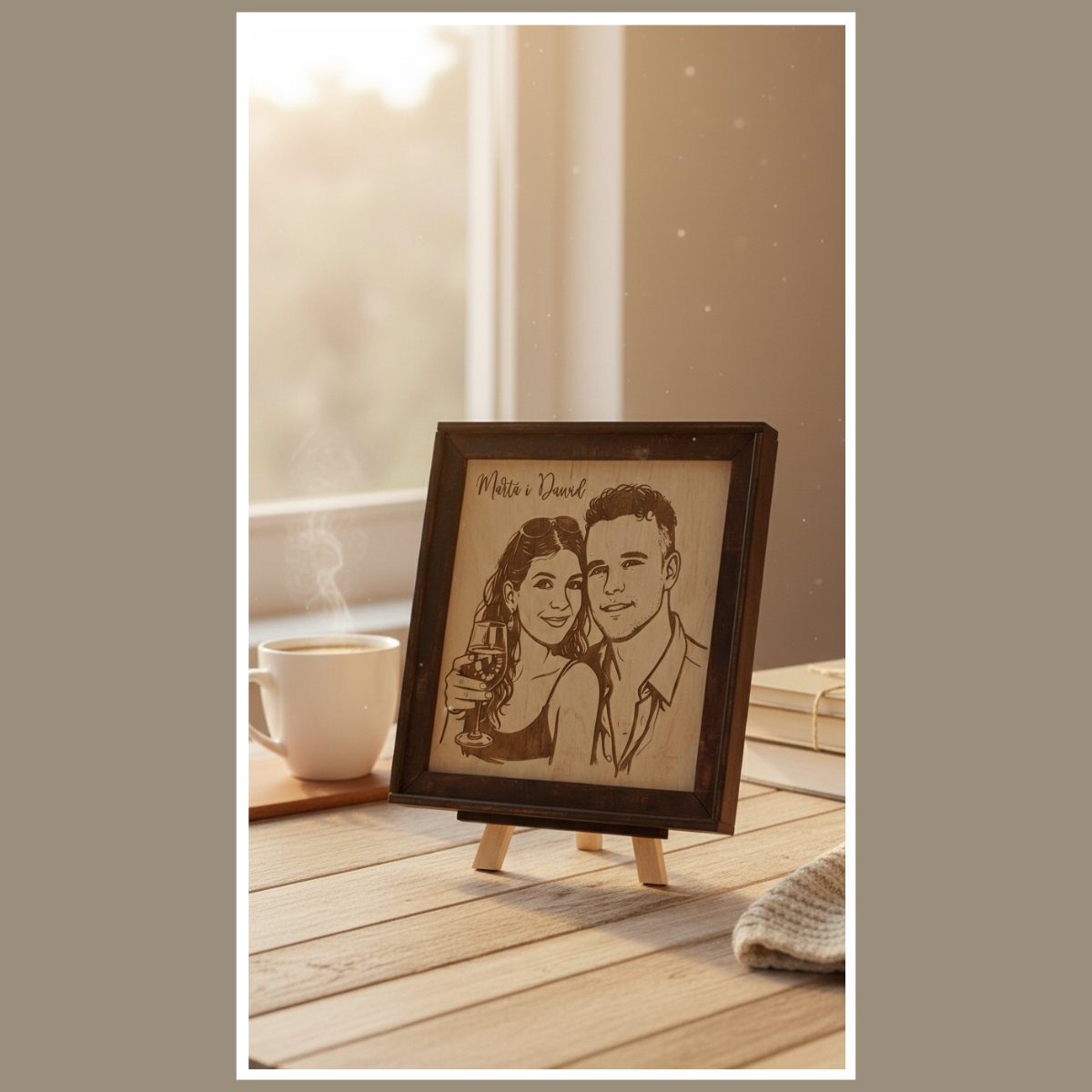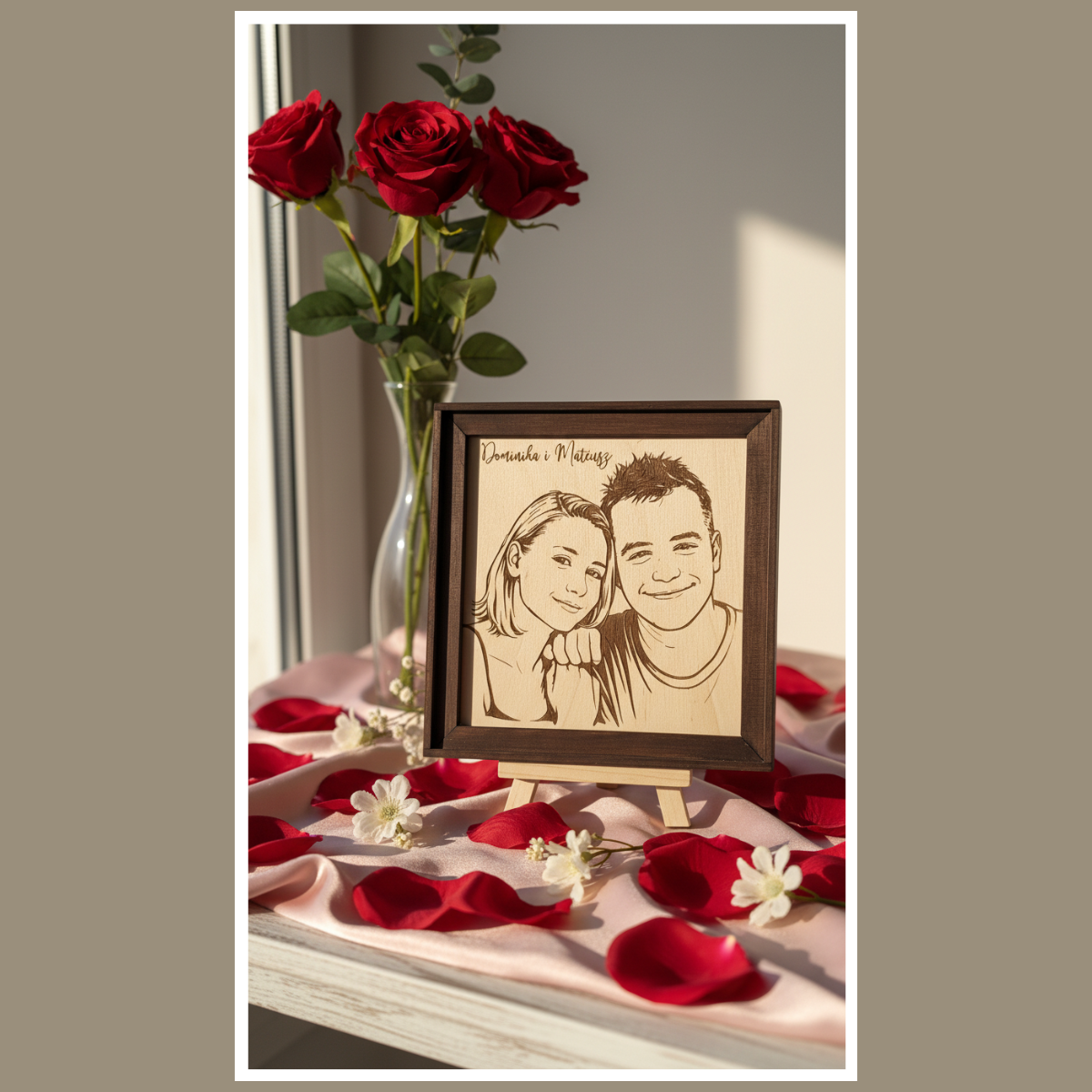 Produkt tworzymy na podstawie przesłanej fotografii. Następnie przygotowujemy projekt portretu i nanosimy go na drewnianą tabliczkę w estetycznej formie. Dodatkowo dodajemy imiona, dlatego całość jest dopasowana do konkretnej pary. Co ważne, układ napisu dobieramy tak, aby był czytelny i dobrze komponował się z portretem.
