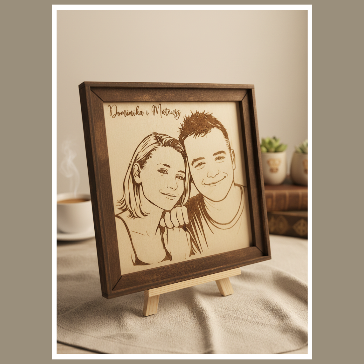 Foto prezent dla pary to personalizowany portret ze zdjęcia na drewnie z imionami. Wgraj wyraźne zdjęcie (opcja „Wgraj zdjęcie”), a imiona wpisz w uwagach do zamówienia – przygotujemy elegancką pamiątkę dla drugiej połówki.