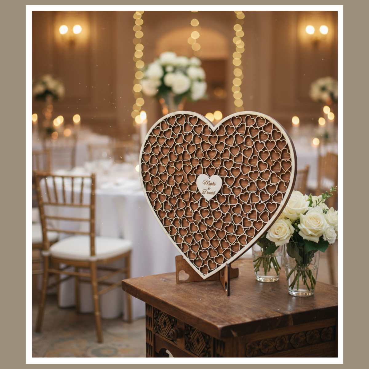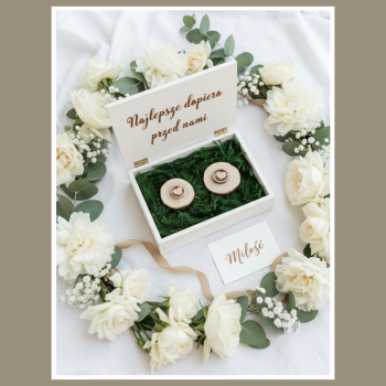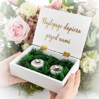 Na środku serca wykonujemy grawer z imionami. W uwagach do zamówienia wpisz imiona pary młodej dokładnie tak, jak mają się pojawić na produkcie. Dzięki temu księga jest w pełni dopasowana do Waszego dnia.