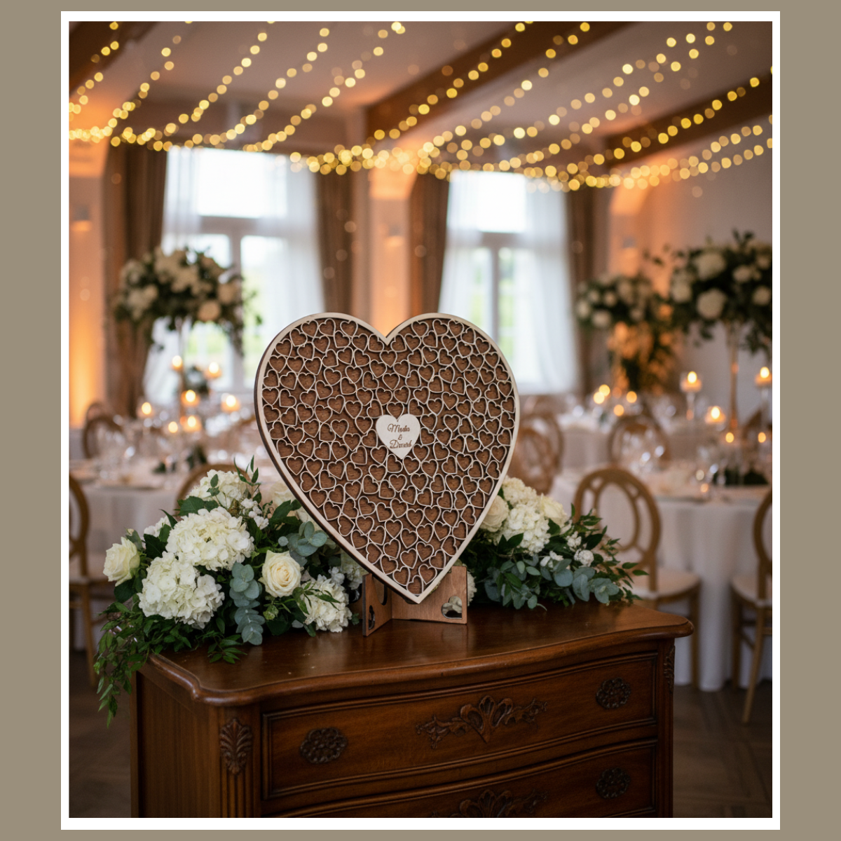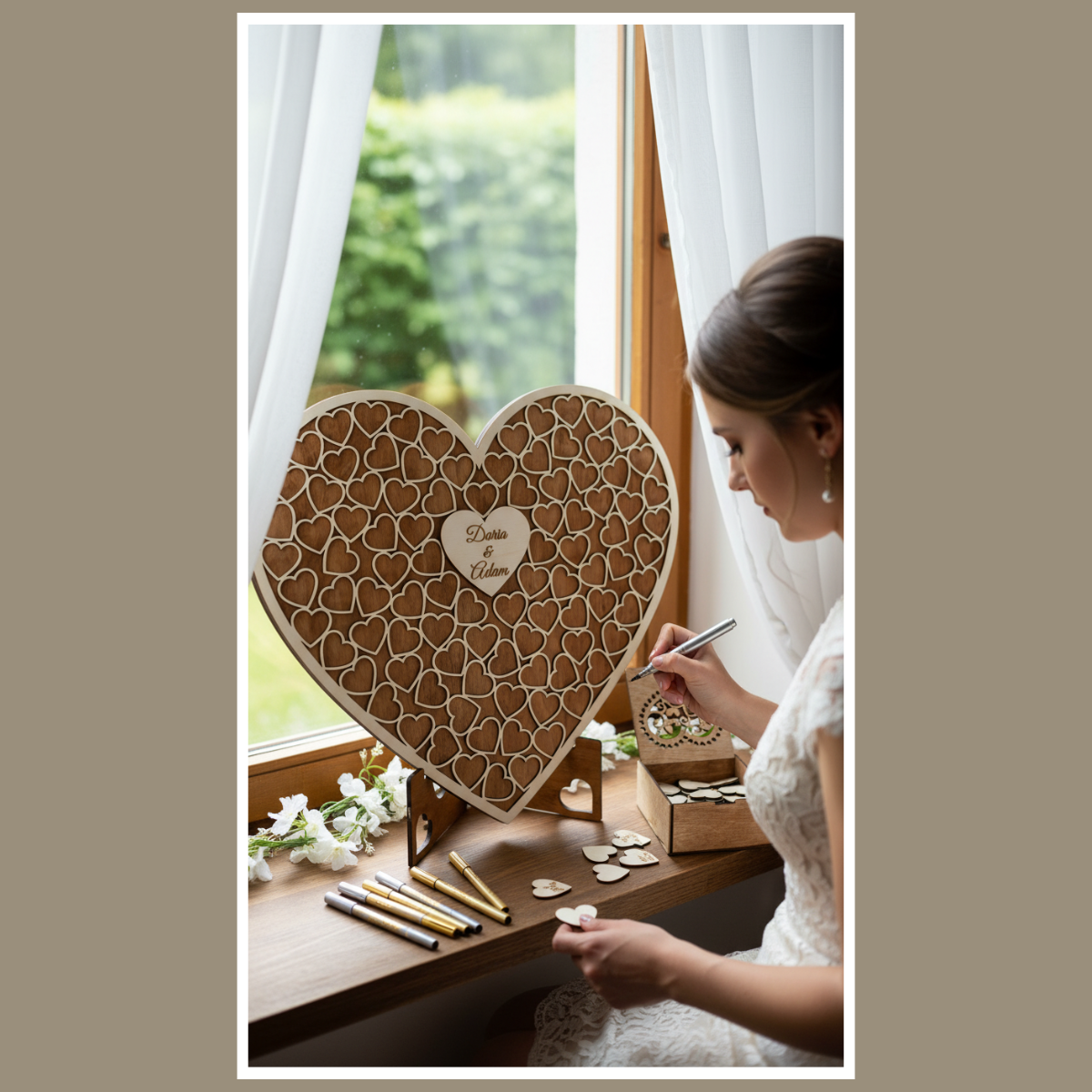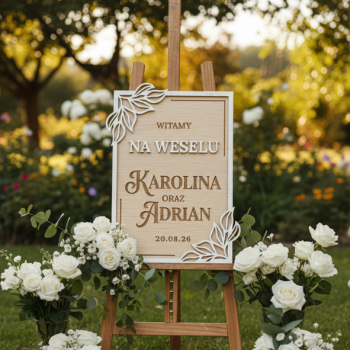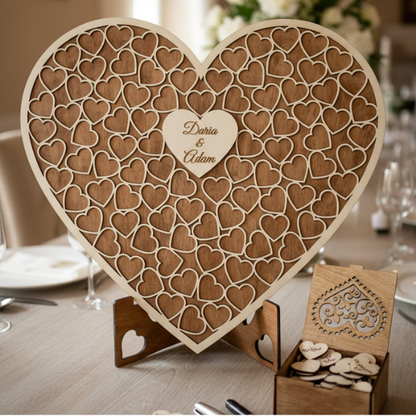 Każdy gość (lub para gości) bierze małe serduszko i składa podpis albo krótkie życzenia. Następnie serduszka trafiają do środka dużego serca. Dzięki temu pamiątka „zapełnia się” w trakcie przyjęcia. To proste rozwiązanie, które angażuje gości i świetnie wygląda na stole powitalnym.