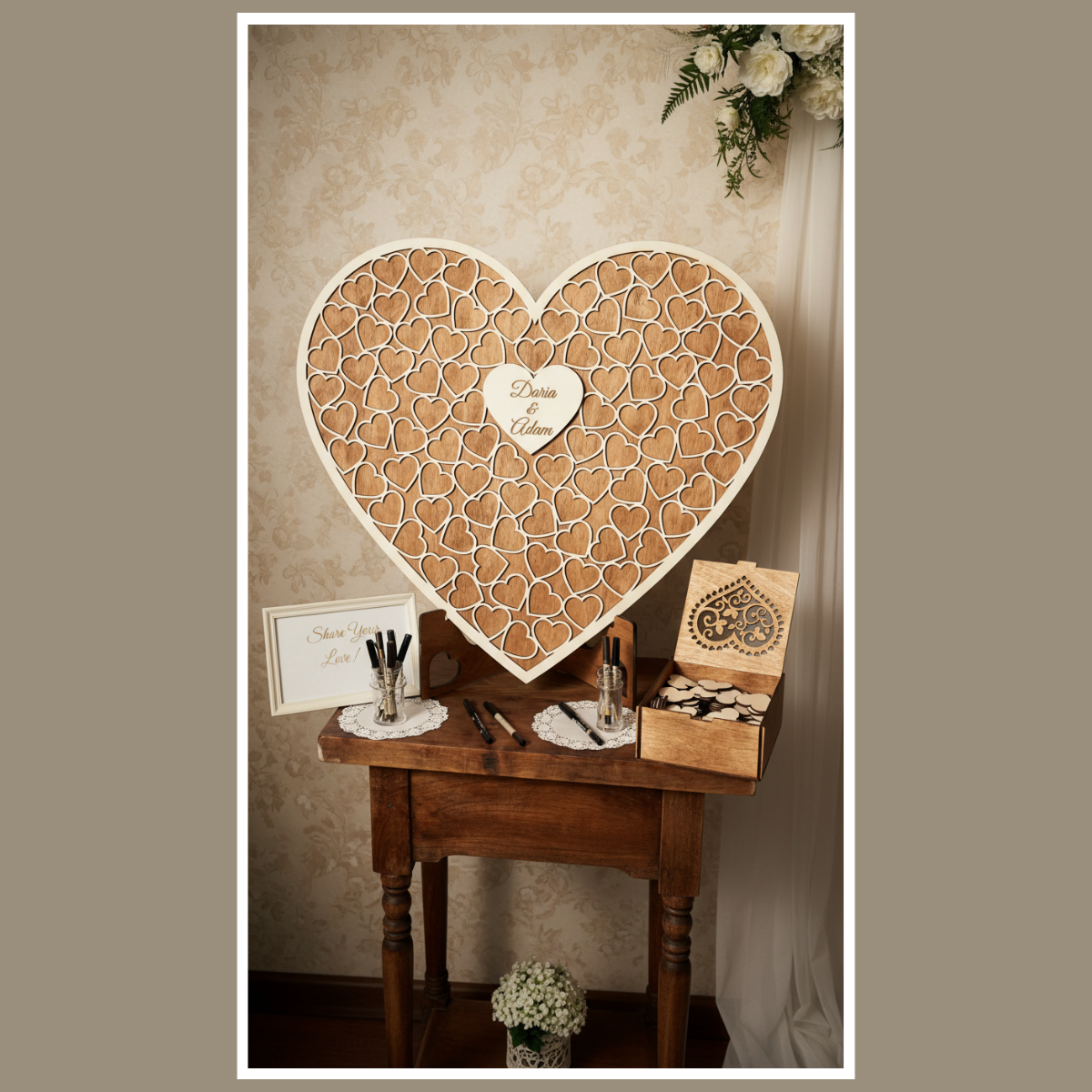 Księga gości w kształcie serca to piękna alternatywa dla tradycyjnej księgi. Zamiast wpisów na kartkach, goście podpisują drewniane serduszka, a Ty zyskujesz pamiątkę, którą później możesz wyeksponować w domu. Całość wygląda elegancko i pasuje do wesel w stylu boho, rustykalnym oraz klasycznym.