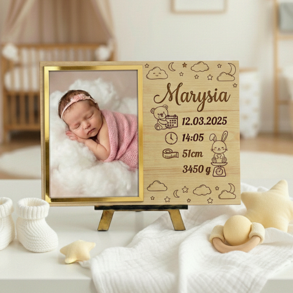 To solidna tabliczka wykonana z litego drewna w rozmiarze 23×32 cm. W zestawie znajduje się stojak, dzięki czemu metryczkę możesz postawić od razu po rozpakowaniu. W tej wersji kompozycja zawiera miejsce na zdjęcie oraz czytelnie rozmieszczone dane narodzin dziecka. Na zdjęciu produktowym widoczna jest ramka ze złotej lustrzanej plexi, która dodaje całości elegancji i pięknie odbija światło.