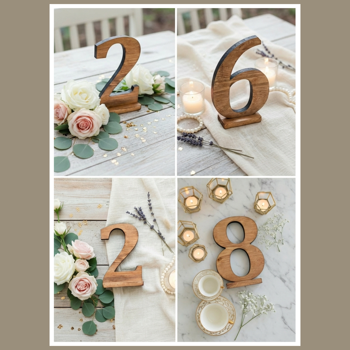 Brązowe numery stołów z drewna pasują do stylu rustykalnego i boho. Jednak dobrze wyglądają też w aranżacjach klasycznych. Z kolei przy jasnych obrusach tworzą wyraźny kontrast. Ponadto świetnie komponują się z zielenią i kwiatami.