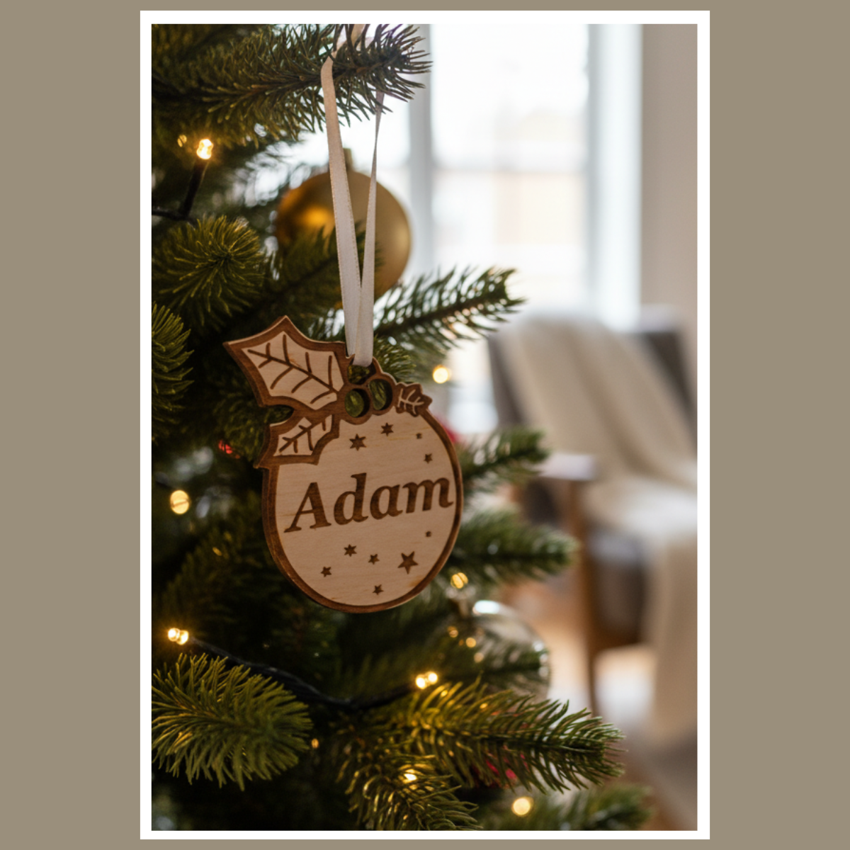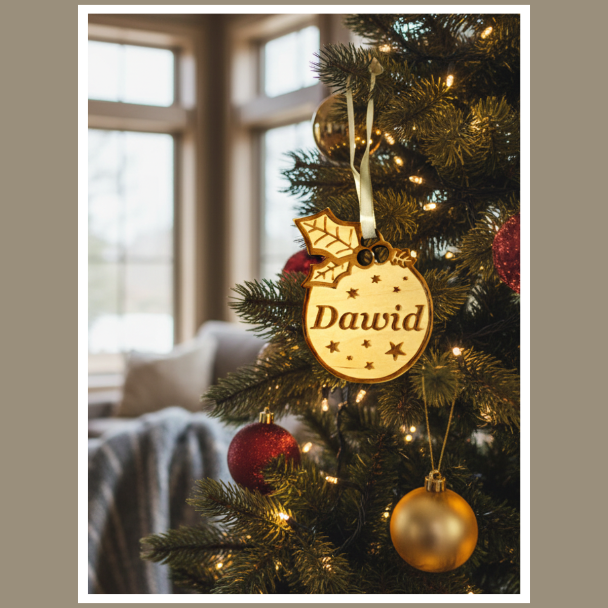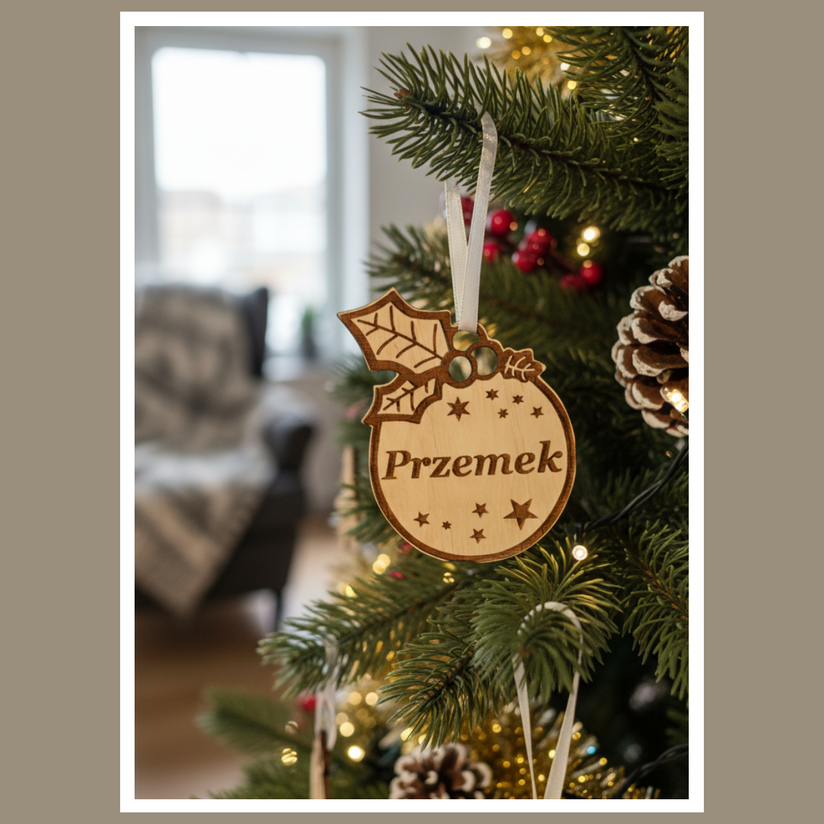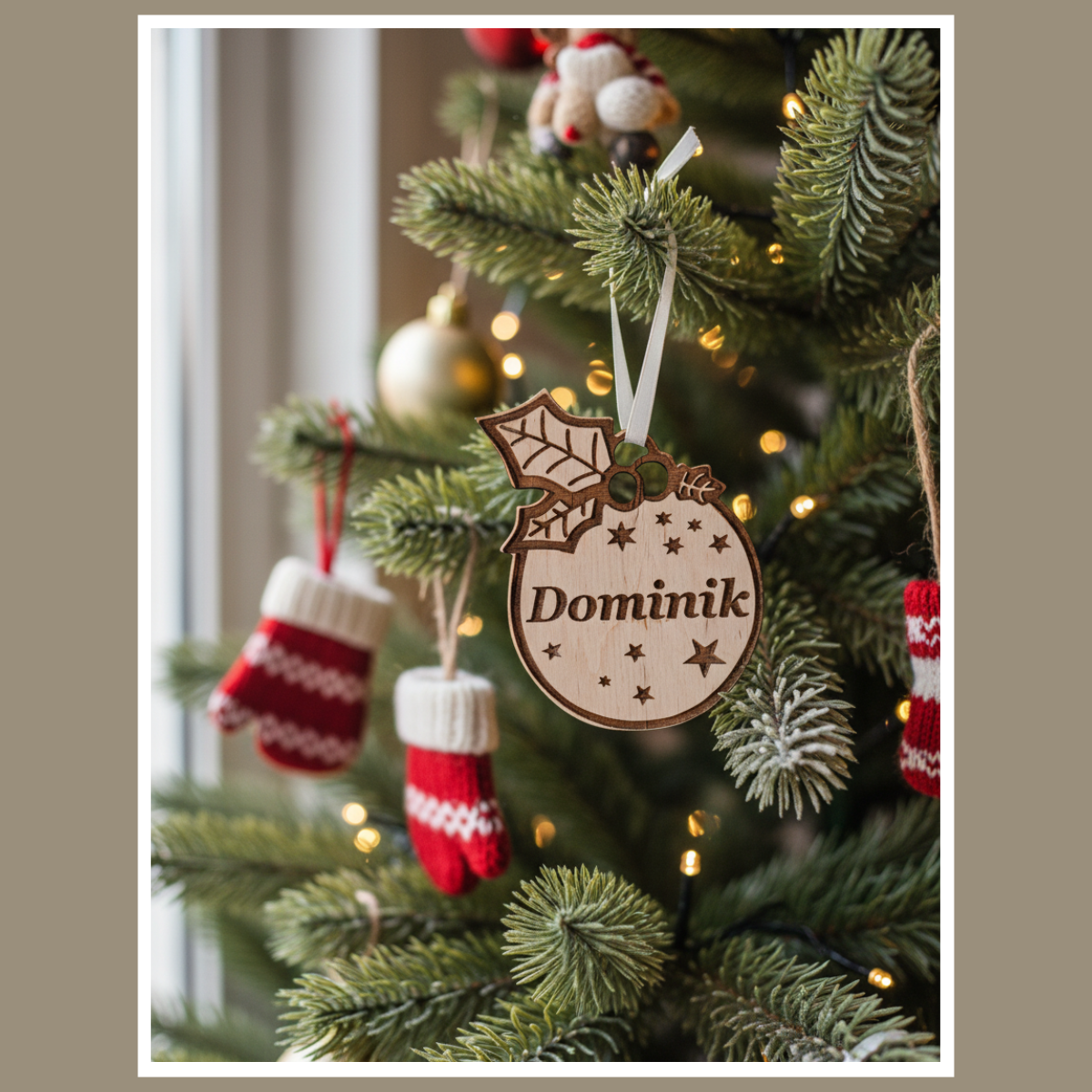 Nadaj swojej choince wyjątkowego charakteru dzięki okrągłej drewnianej bombce z imieniem! To personalizowana ozdoba choinkowa wykonana z naturalnego drewna, grawerowana z najwyższą precyzją.