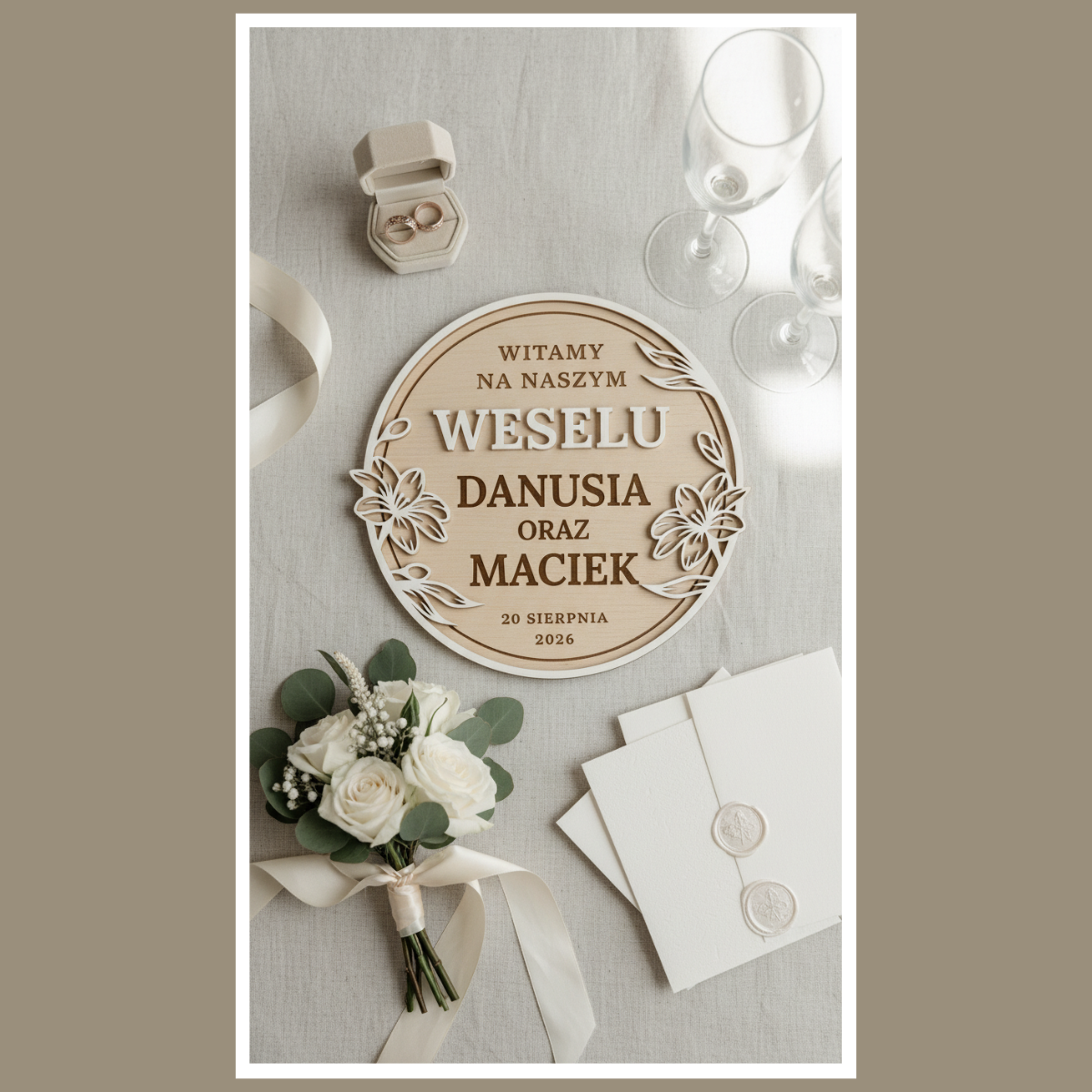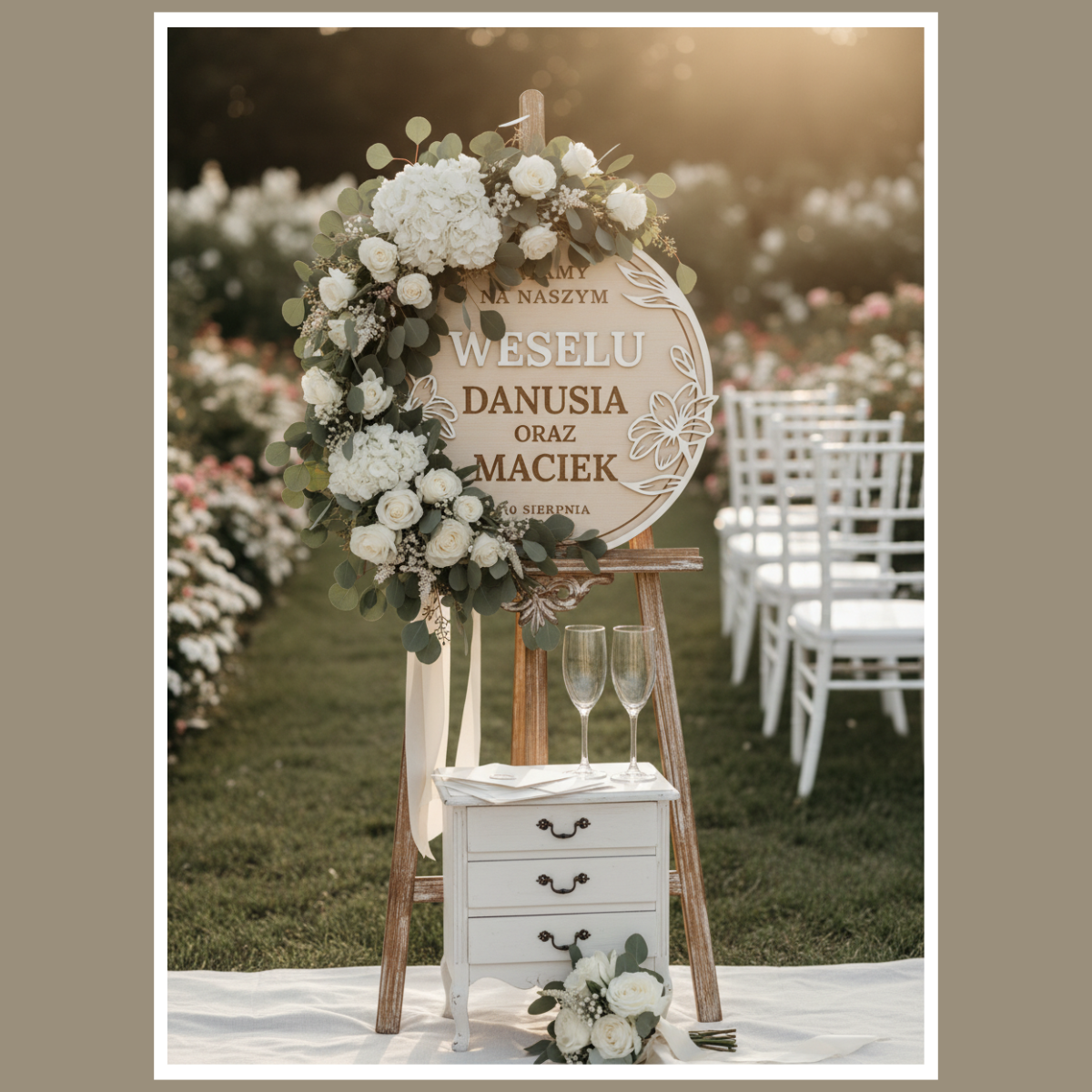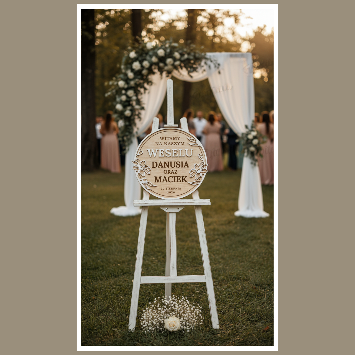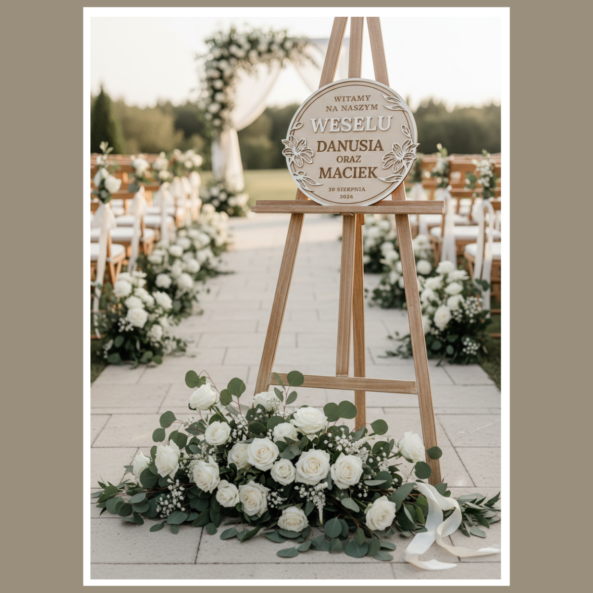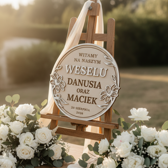 Tablica ma okrągły kształt i czytelny, warstwowy napis. Dzięki temu jest dobrze widoczna na zdjęciach. Dodatkowo motyw roślinny podkreśla ślubny charakter. To detal, który robi „wow”, ale nie przytłacza aranżacji.