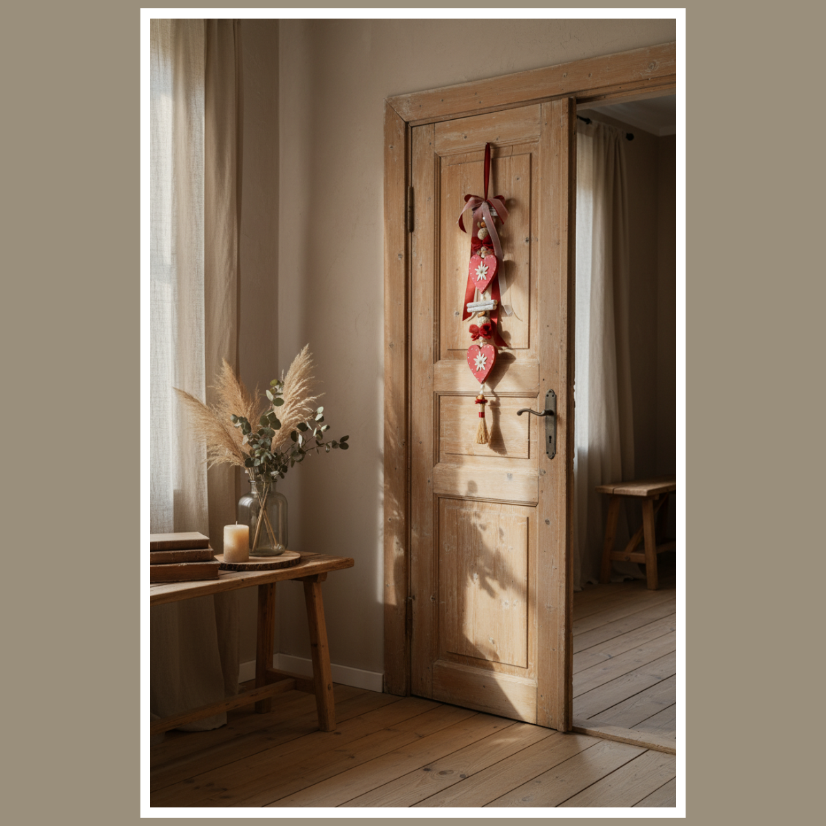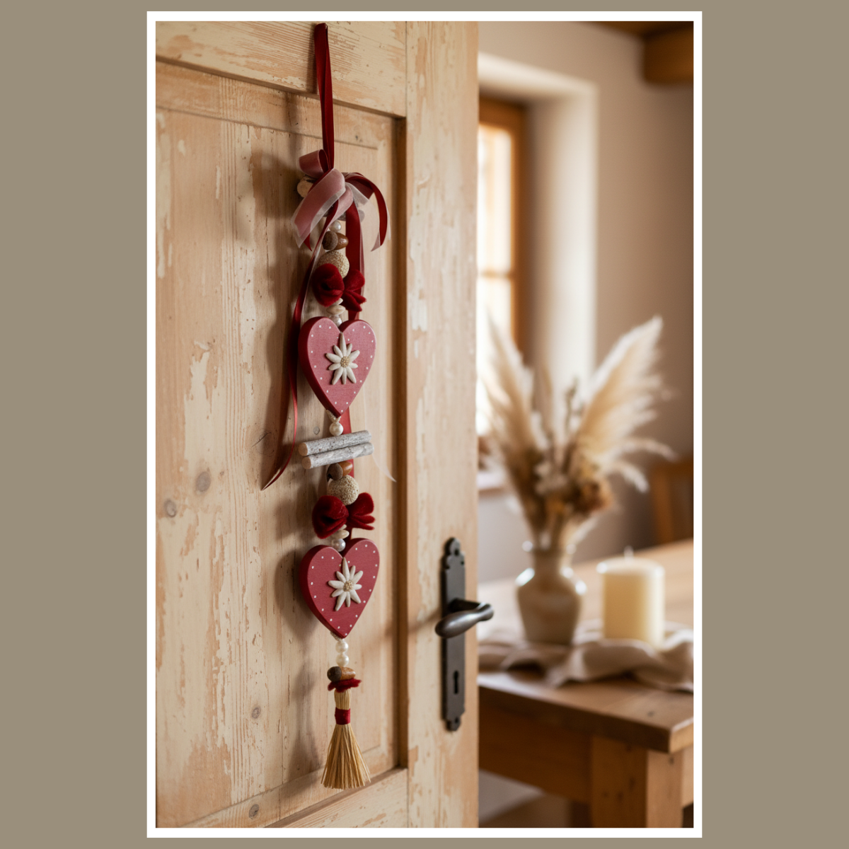Dekoracja wisząca „Bordo serca z szarotką” – ręcznie wykonana ozdoba z drewnianymi sercami, wstążkami i chwostem. Idealna na drzwi, okno lub ścianę – w ciepłym, naturalnym stylu.