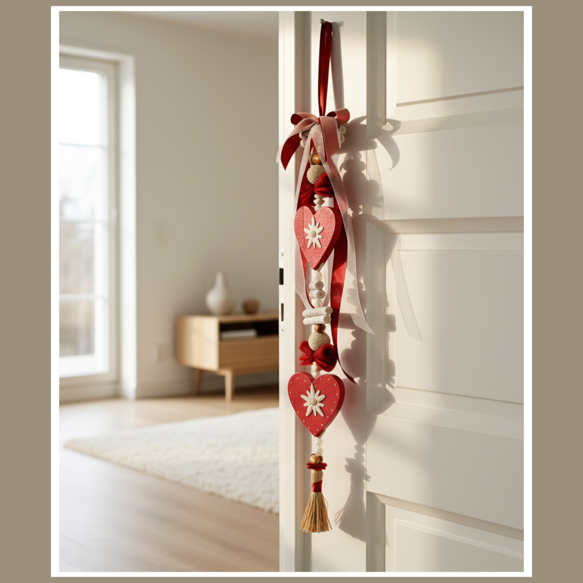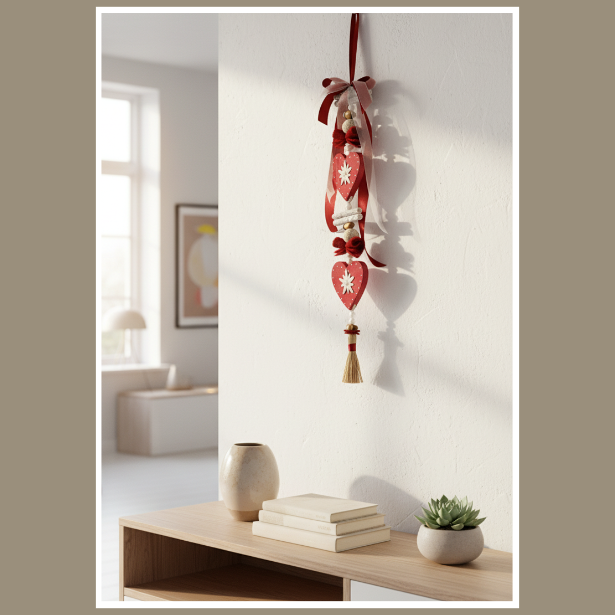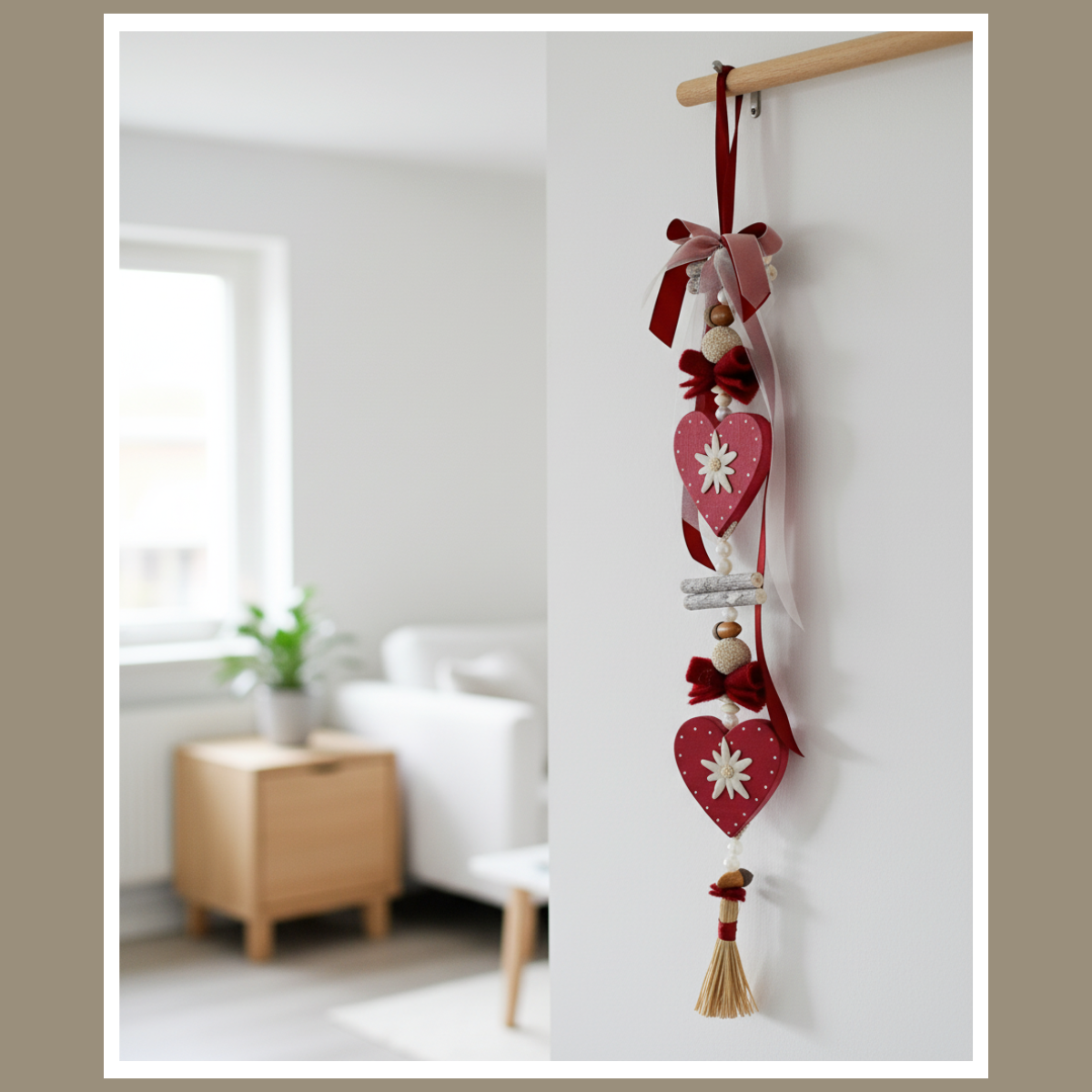 Szukasz dekoracji, która od razu ociepli wnętrze i będzie wyglądać świetnie przez cały rok? Dekoracja wisząca bordo – serca z szarotką to jedna z tych ozdób, z których jesteśmy najbardziej znani. Ręcznie składana kompozycja z drewnianymi sercami, szarotką oraz miękkimi wstążkami i chwostem wygląda przytulnie, a jednocześnie przyciąga wzrok.