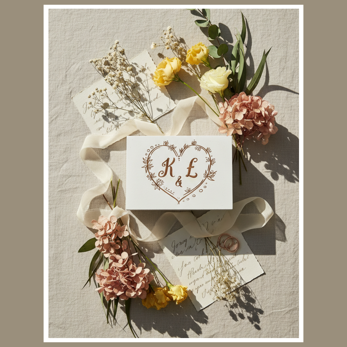 Na wieczku umieszczamy inicjały pary młodej. Dzięki temu pudełko staje się pamiątką na lata. Co ważne, możesz też wybrać tekst w środku. Jeśli nie podasz własnego, wykonamy standardowy, elegancki napis (jak na przykładowej aranżacji).