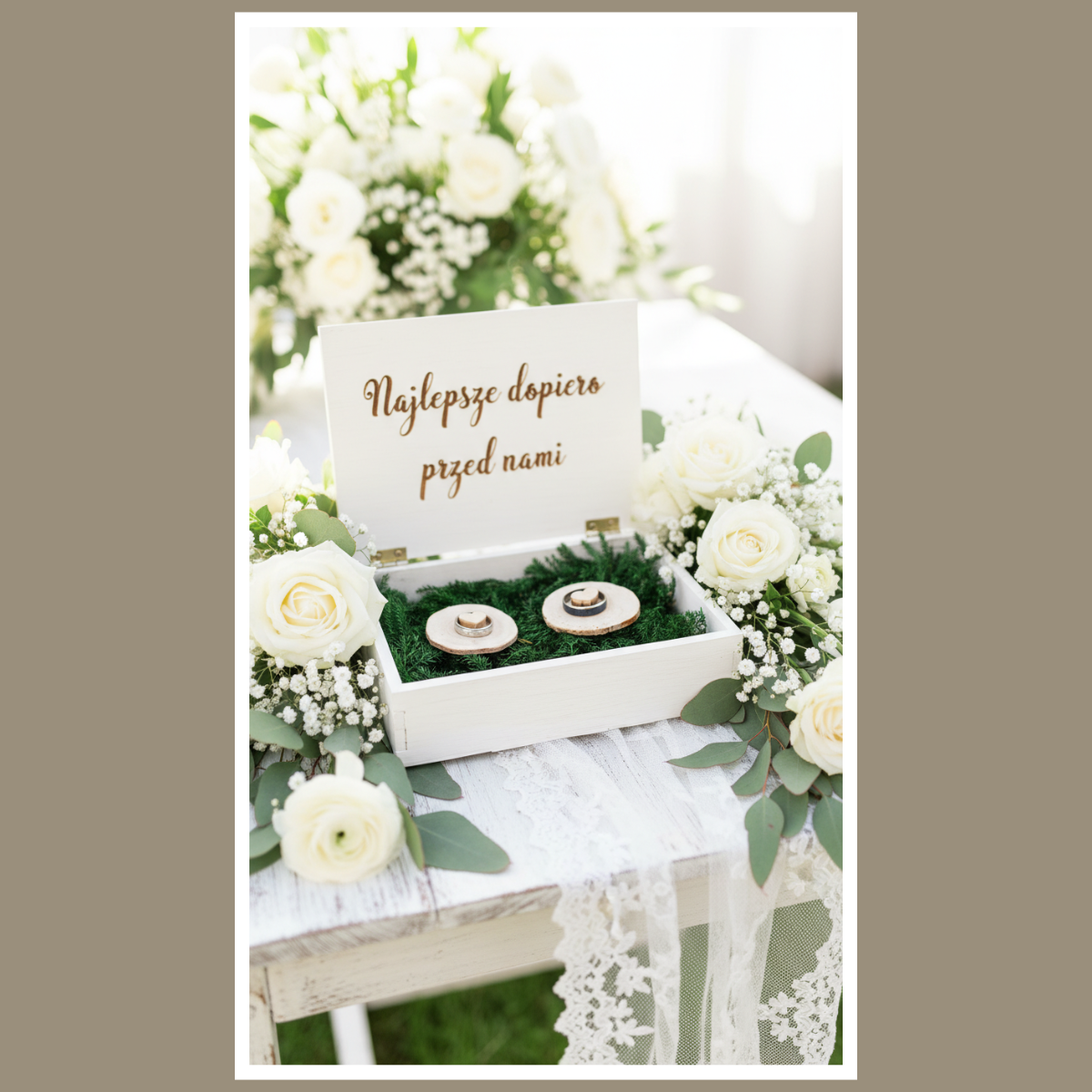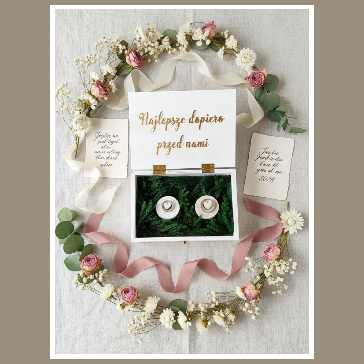 Pudełko ma białą, lekką wizualnie formę. W środku znajduje się miękki mech, który tworzy naturalne tło. Obrączki układają się stabilnie, więc całość wygląda pewnie podczas podawania ich do ceremonii. Ponadto pudełko świetnie komponuje się z kwiatami, zielenią i dodatkami w stylu boho.