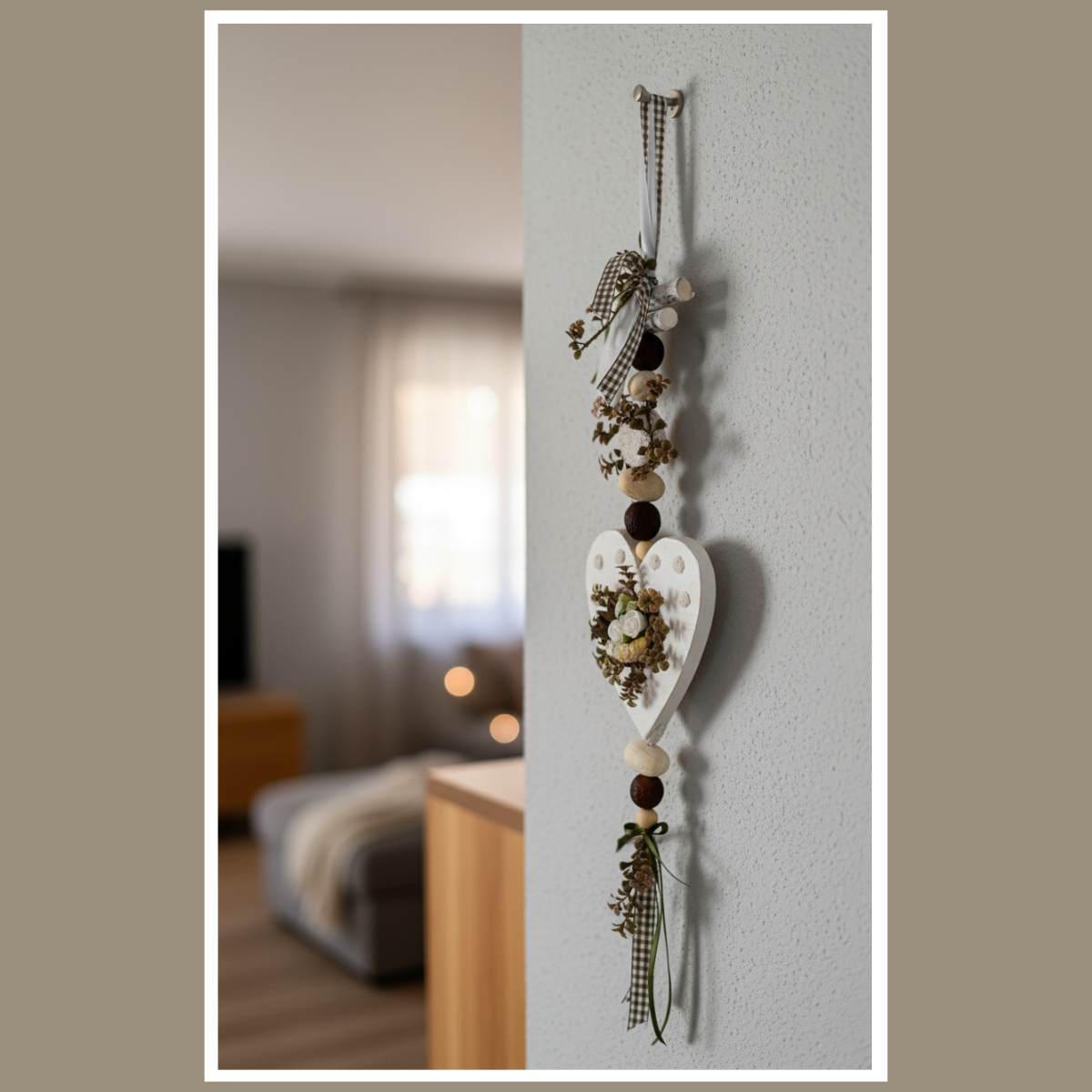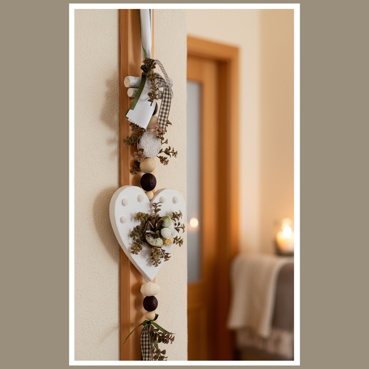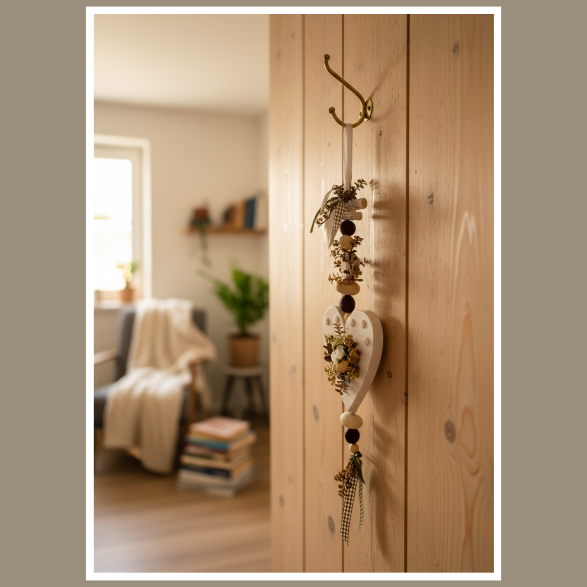 Rustykalna ozdoba wisząca z sercem to dekoracja, która od razu ociepla wnętrze. Łączy naturalne drewno, delikatne roślinne akcenty i stonowane kolory, dzięki czemu pasuje do domu przez cały rok.