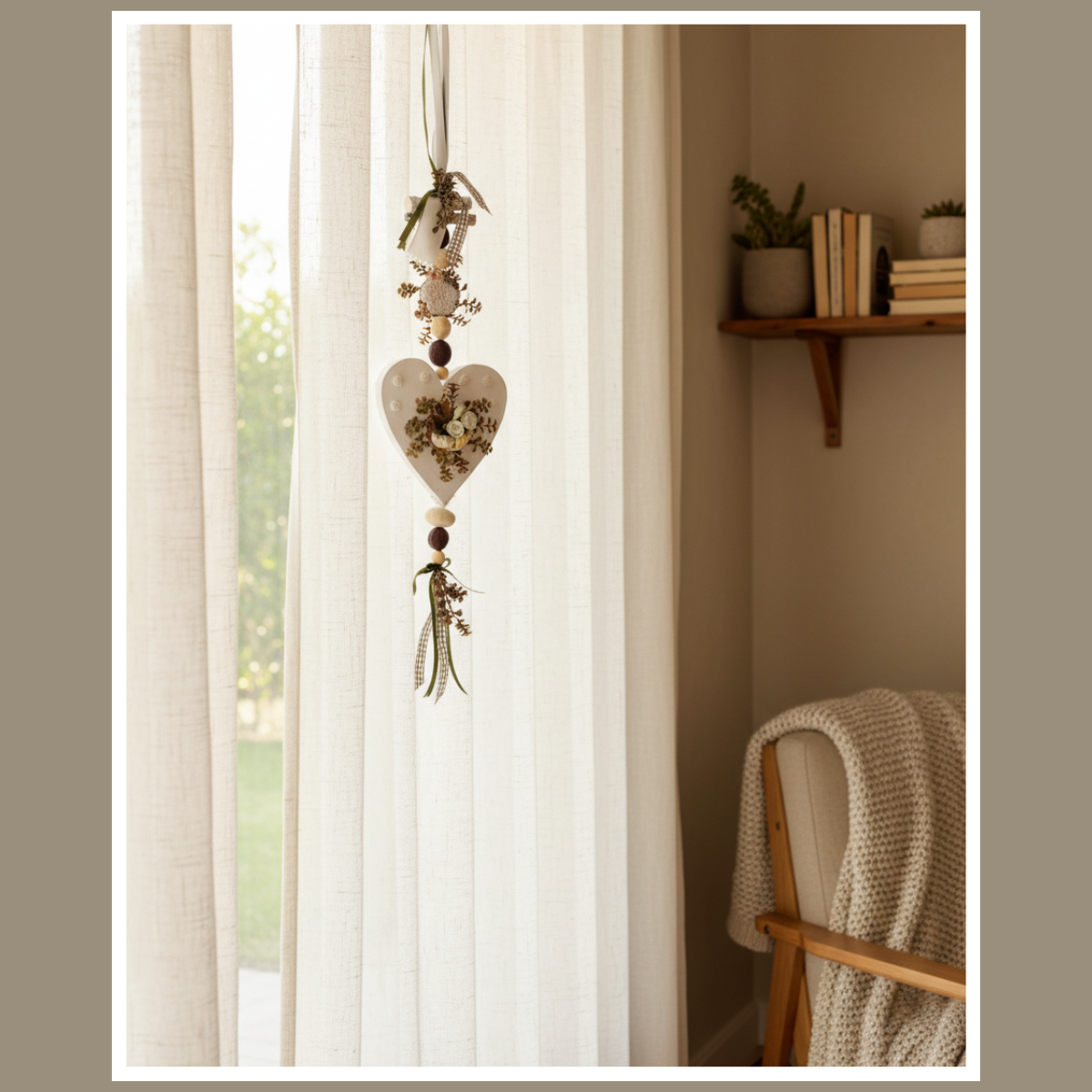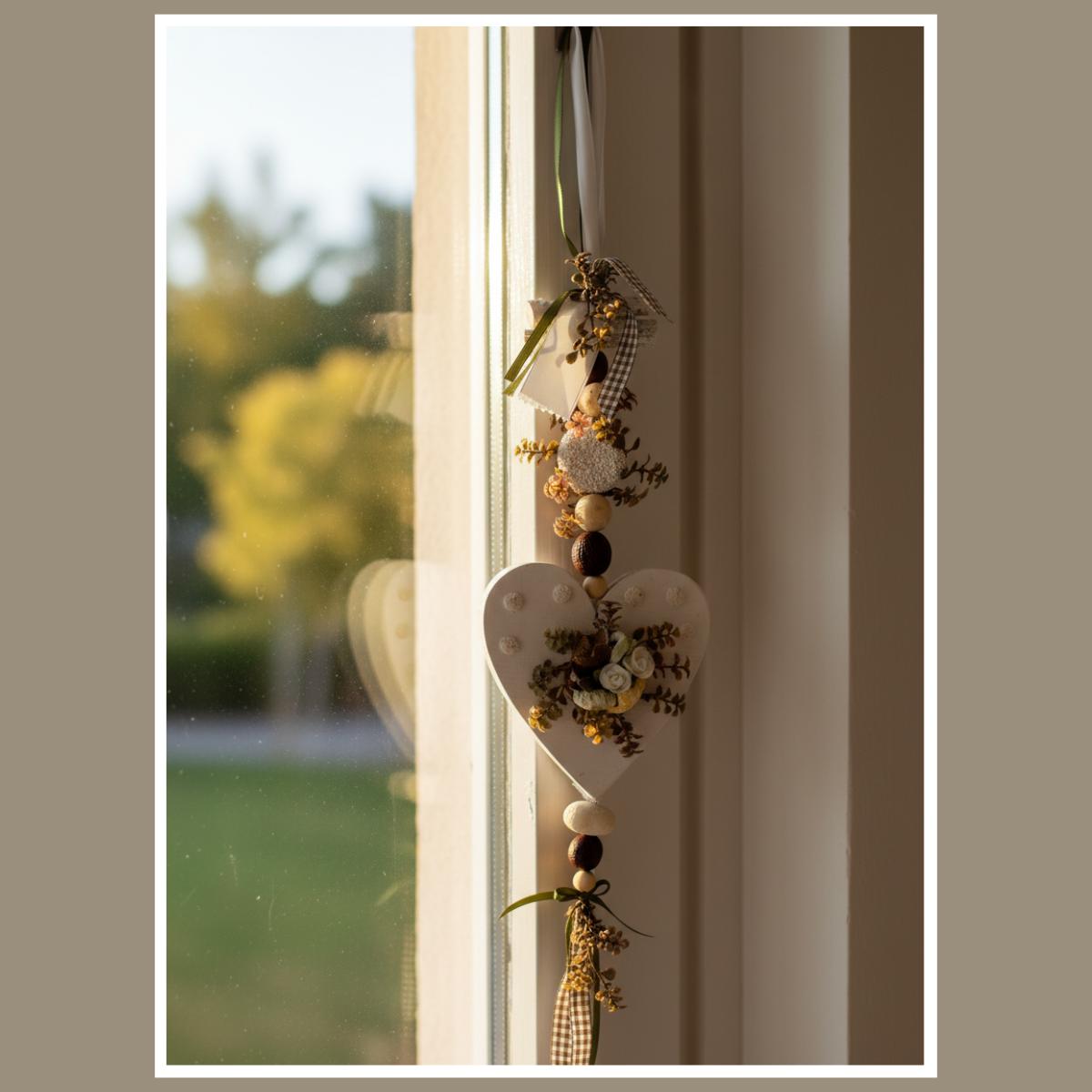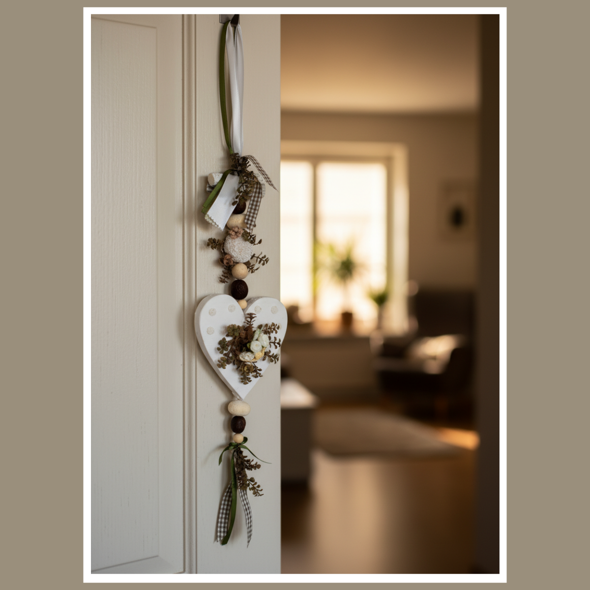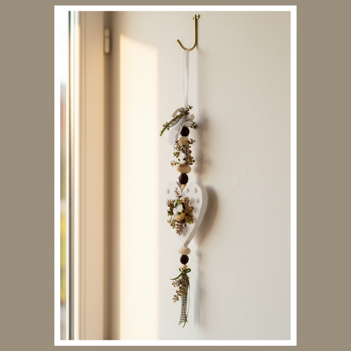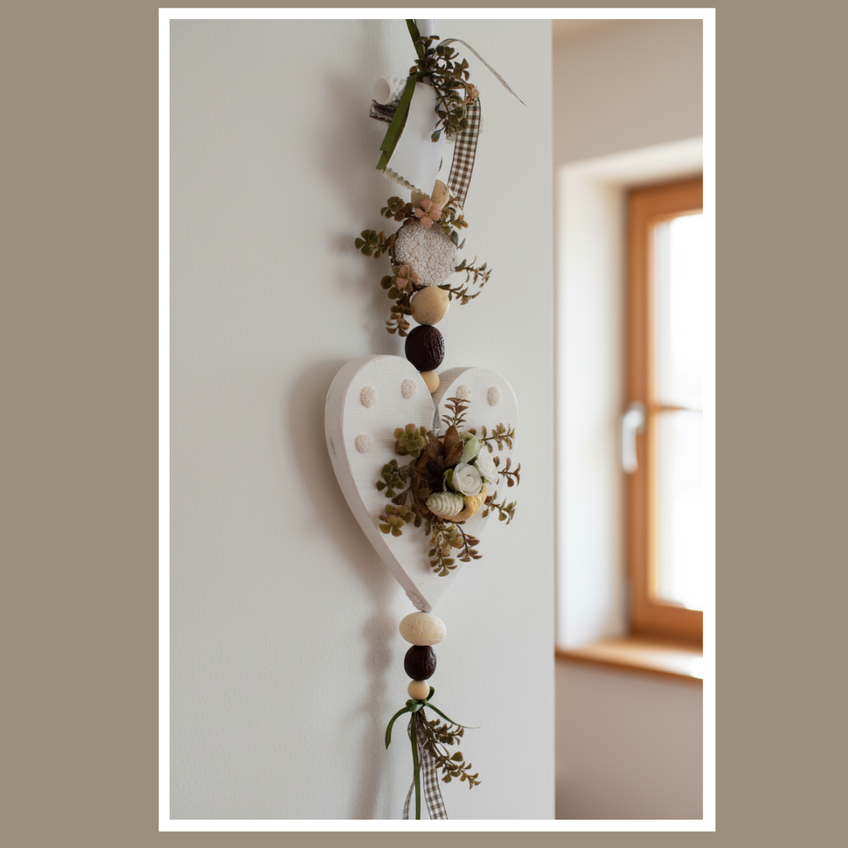 Rustykalna ozdoba wisząca z sercem w naturalnych kolorach – biel, zieleń i drewniane detale. Idealna na drzwi, ścianę lub okno, jeśli chcesz dodać wnętrzu przytulności i ciepła.