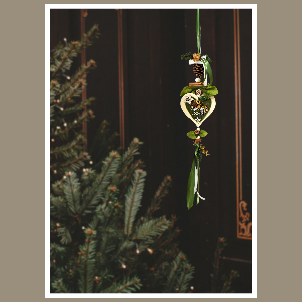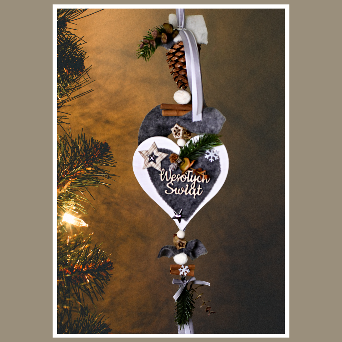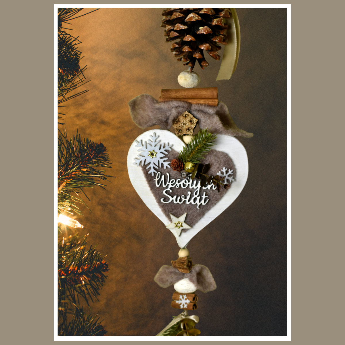 Ta wyjątkowa drewniana ozdoba świąteczna w kształcie serca została wykonana ręcznie z dbałością o każdy szczegół. Naturalne drewno, filc, gałązki świerku, szyszki, laska cynamonu i delikatne wstążki tworzą harmonijną, bożonarodzeniową kompozycję.
