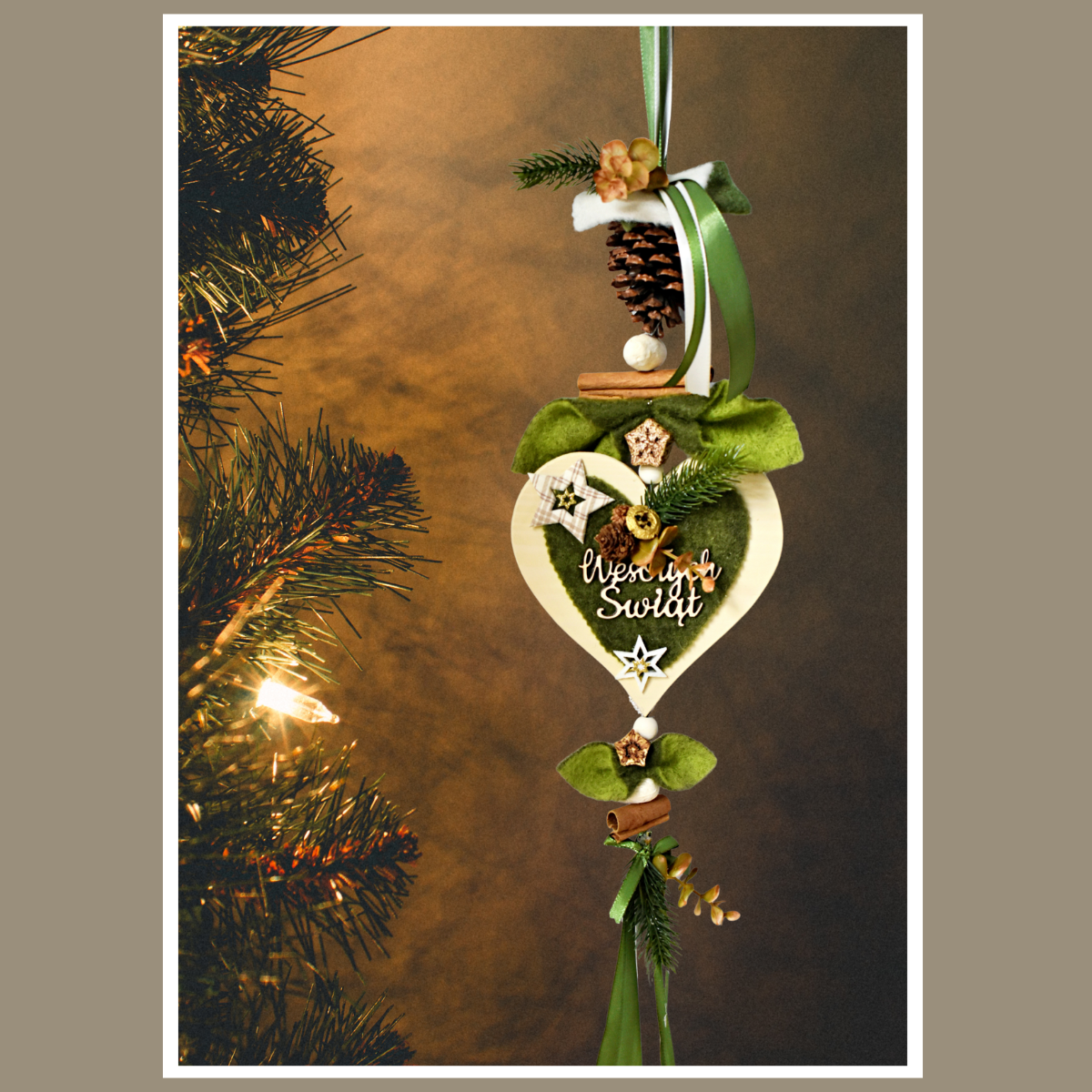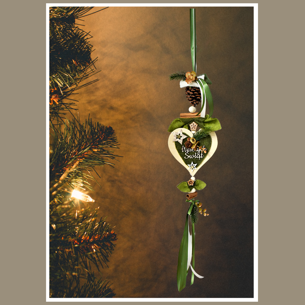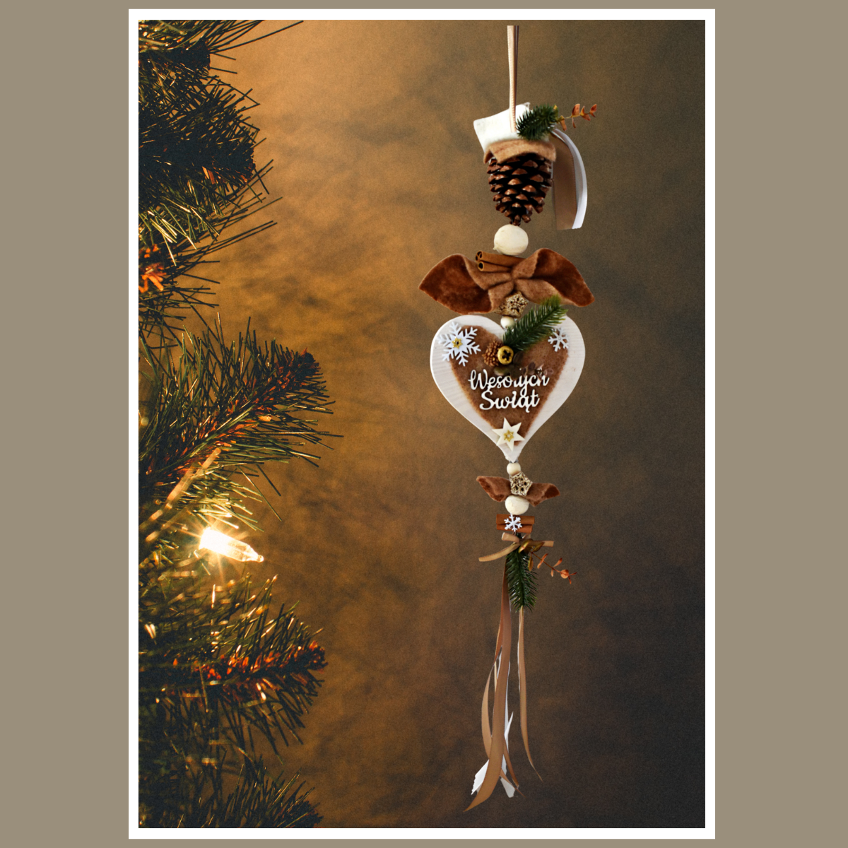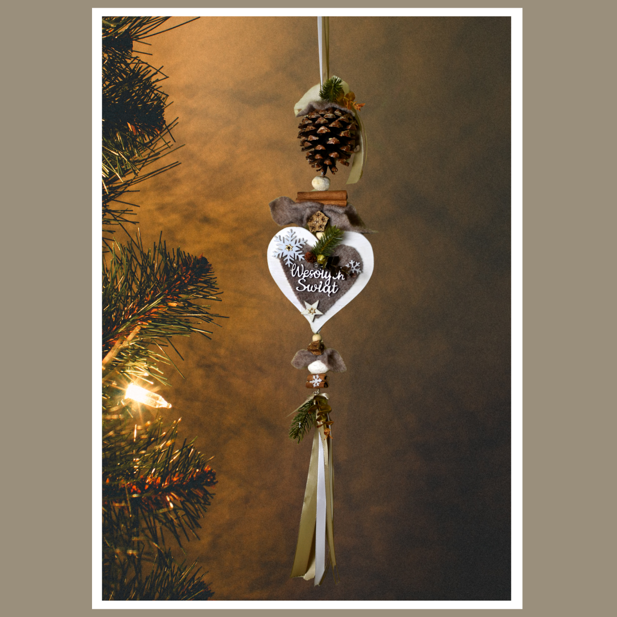 Ta wyjątkowa drewniana ozdoba świąteczna w kształcie serca została wykonana ręcznie z dbałością o każdy szczegół. Naturalne drewno, filc, gałązki świerku, szyszki, laska cynamonu i delikatne wstążki tworzą harmonijną, bożonarodzeniową kompozycję.