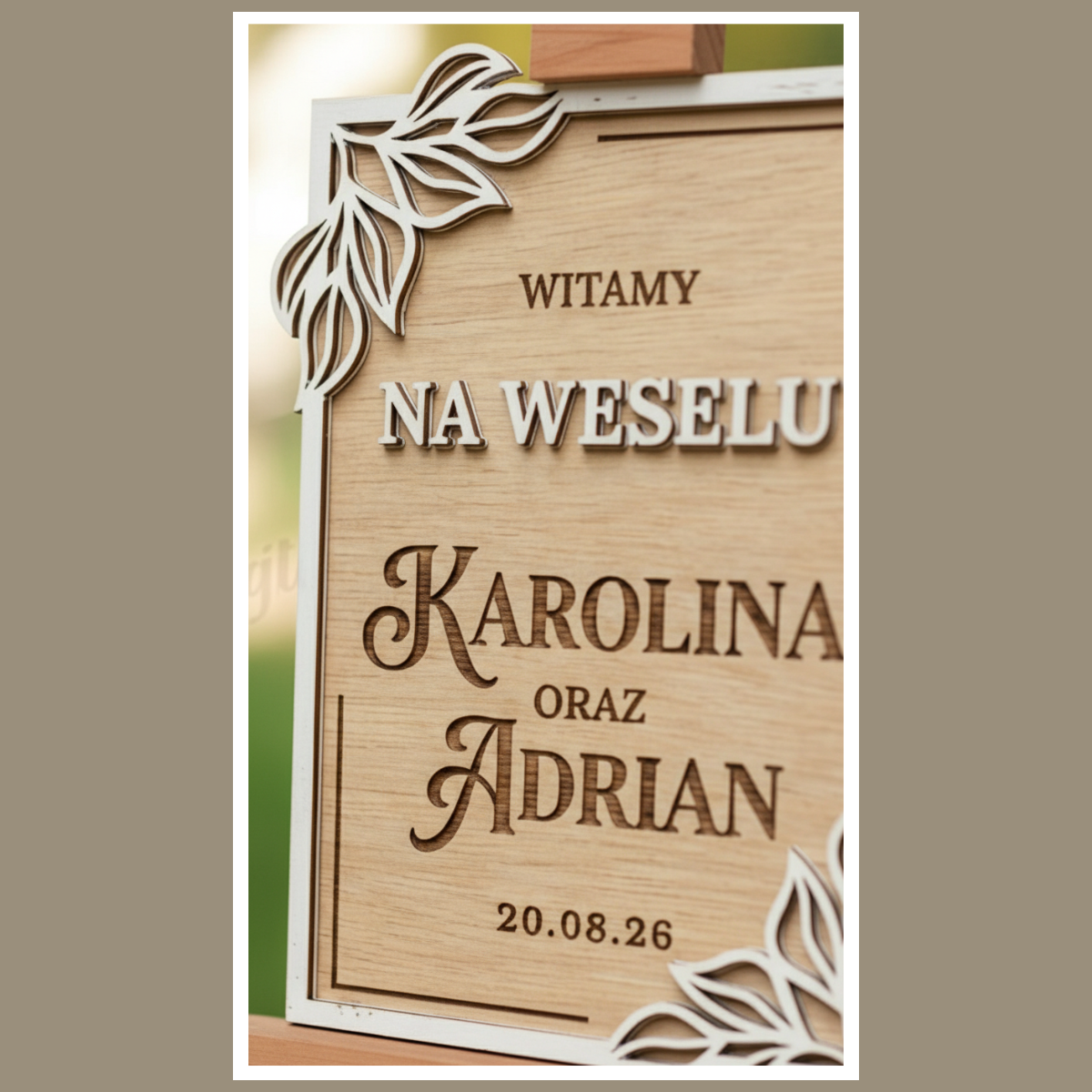 Na tablicy umieszczamy klasyczny napis powitalny oraz dane pary młodej. Dzięki temu dekoracja jest „Wasza” i zostaje jako pamiątka po uroczystości. W uwagach do zamówienia podaj: imiona oraz datę ślubu. Jeśli chcesz inny zapis daty lub inny układ imion, dopisz to w tej samej wiadomości.
