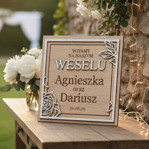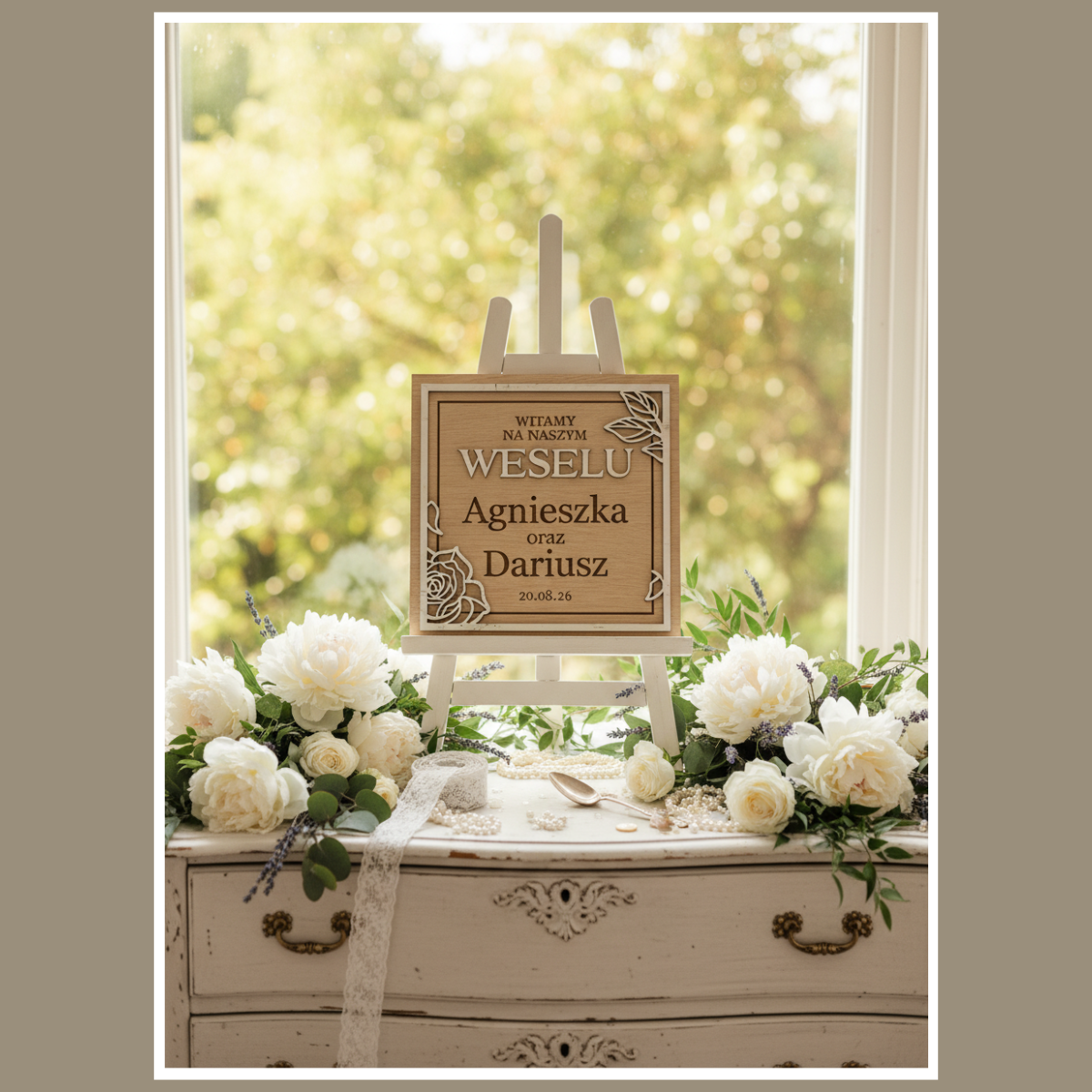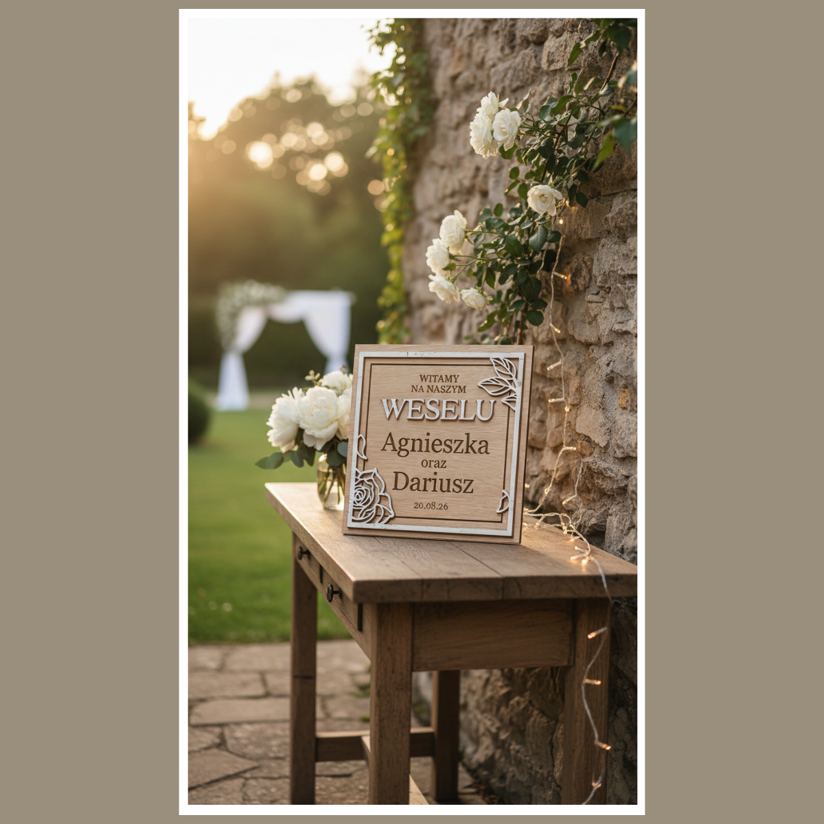 Kwadratowa tablica powitalna świetnie wygląda przy wejściu, obok księgi gości albo przy planie stołów. Możesz ją ustawić w sali, na tarasie lub w plenerze. Dobrze komponuje się z kwiatami, świecami i zielenią. To także praktyczny punkt orientacyjny, zwłaszcza gdy wesele odbywa się w większym obiekcie.
