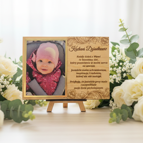 Drewniana tabliczka ze zdjęciem dla dziadków 37×22 cm z Twoją fotografią i dedykacją. Lite drewno, stojak w zestawie, elegancki grawer kwiatowy – idealny prezent dla babci i dziadka od wnuków.