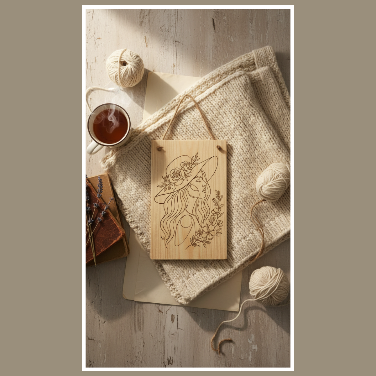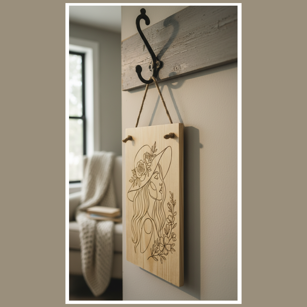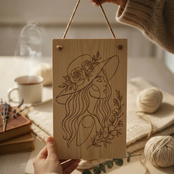 Drewniana tabliczka z grawerem kobieta w kapeluszu to dekoracja, która przyciąga uwagę detalem, a jednocześnie pozostaje lekka i elegancka. Wykonana na naturalnym drewnie, z dopracowanym grawerem przedstawiającym profil kobiety w kapeluszu oraz kwiatowe elementy, pasuje do wnętrz boho, rustykalnych i naturalnych. Dzięki temu, że drewno ma własne usłojenie, każdy egzemplarz może delikatnie różnić się odcieniem, co podkreśla charakter rękodzieła.