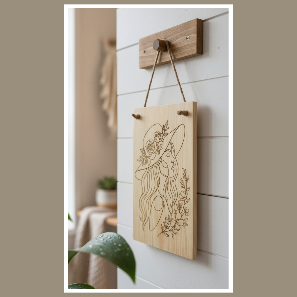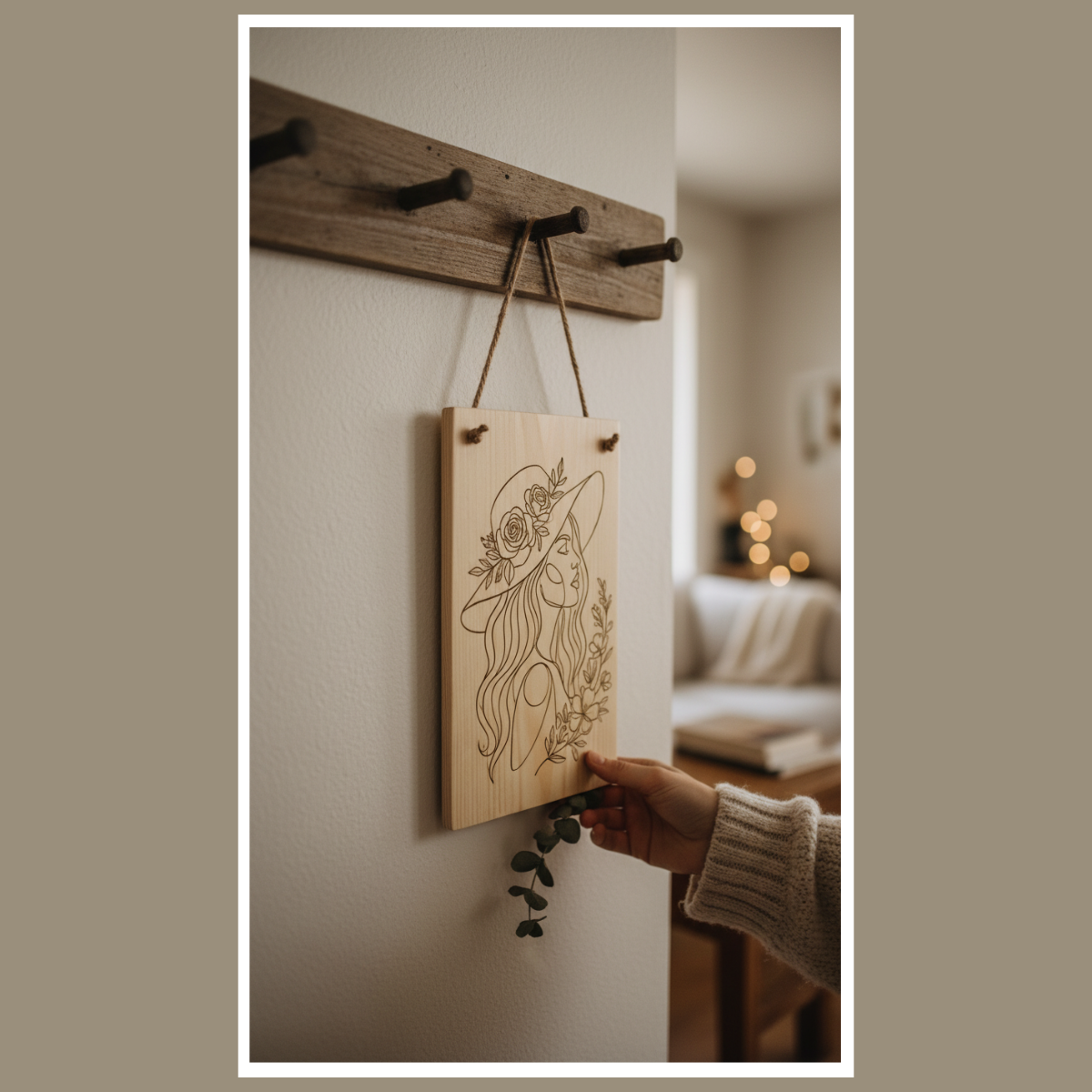 Drewniana tabliczka z grawerem „Kobieta w kapeluszu” to subtelna dekoracja w stylu boho. Naturalne drewno i precyzyjny rysunek z kwiatami ocieplają wnętrze i dodają mu przytulności.