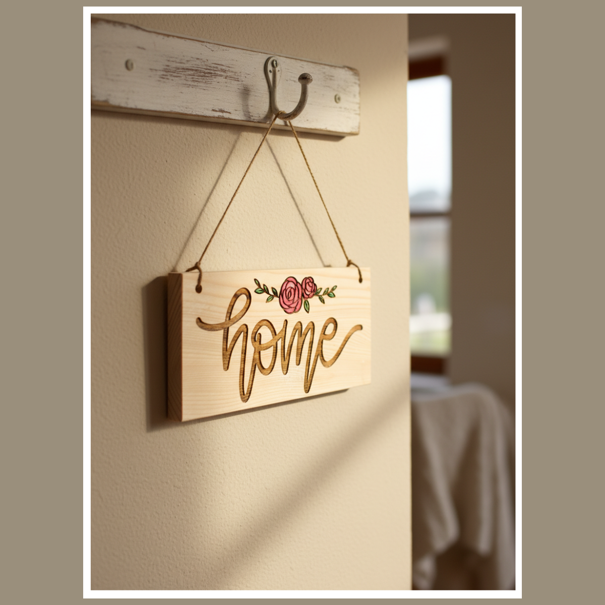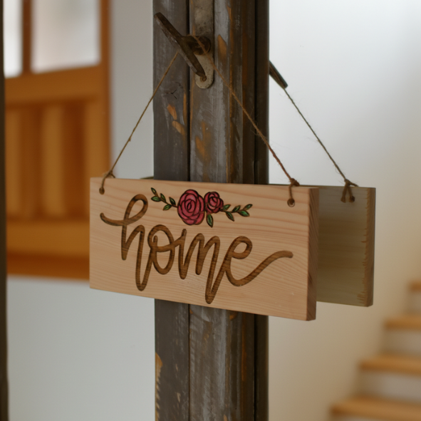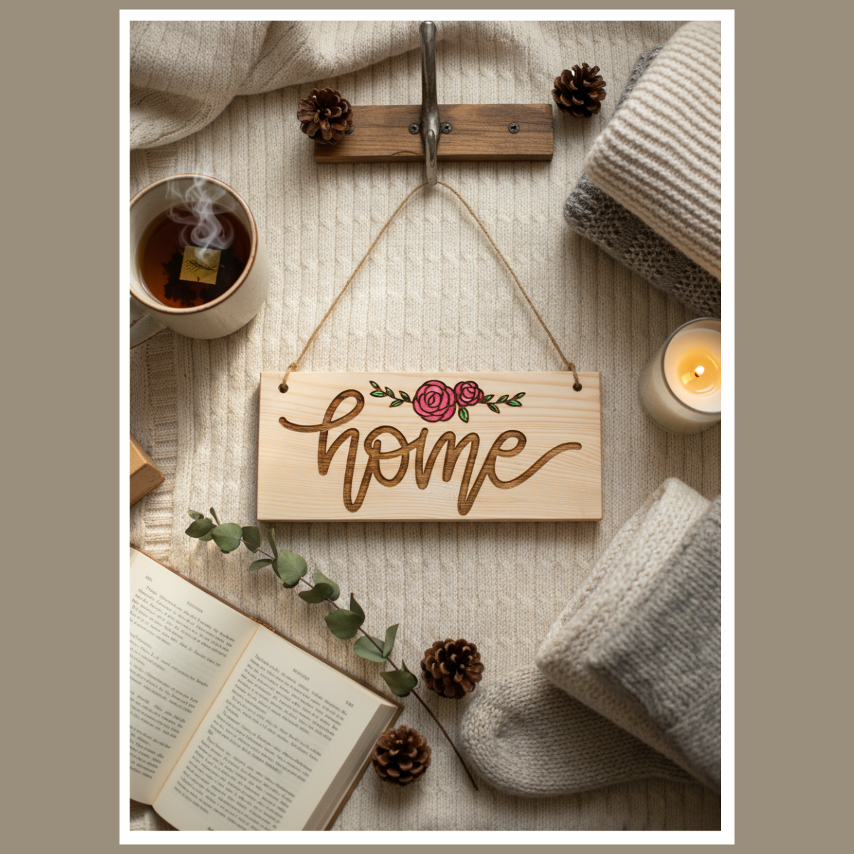 Tabliczka „Home” – drewniana zawieszka z motywem róży i sznurkiem do powieszenia. Idealna na drzwi, do wiatrołapu lub jako ciepły akcent w domu.