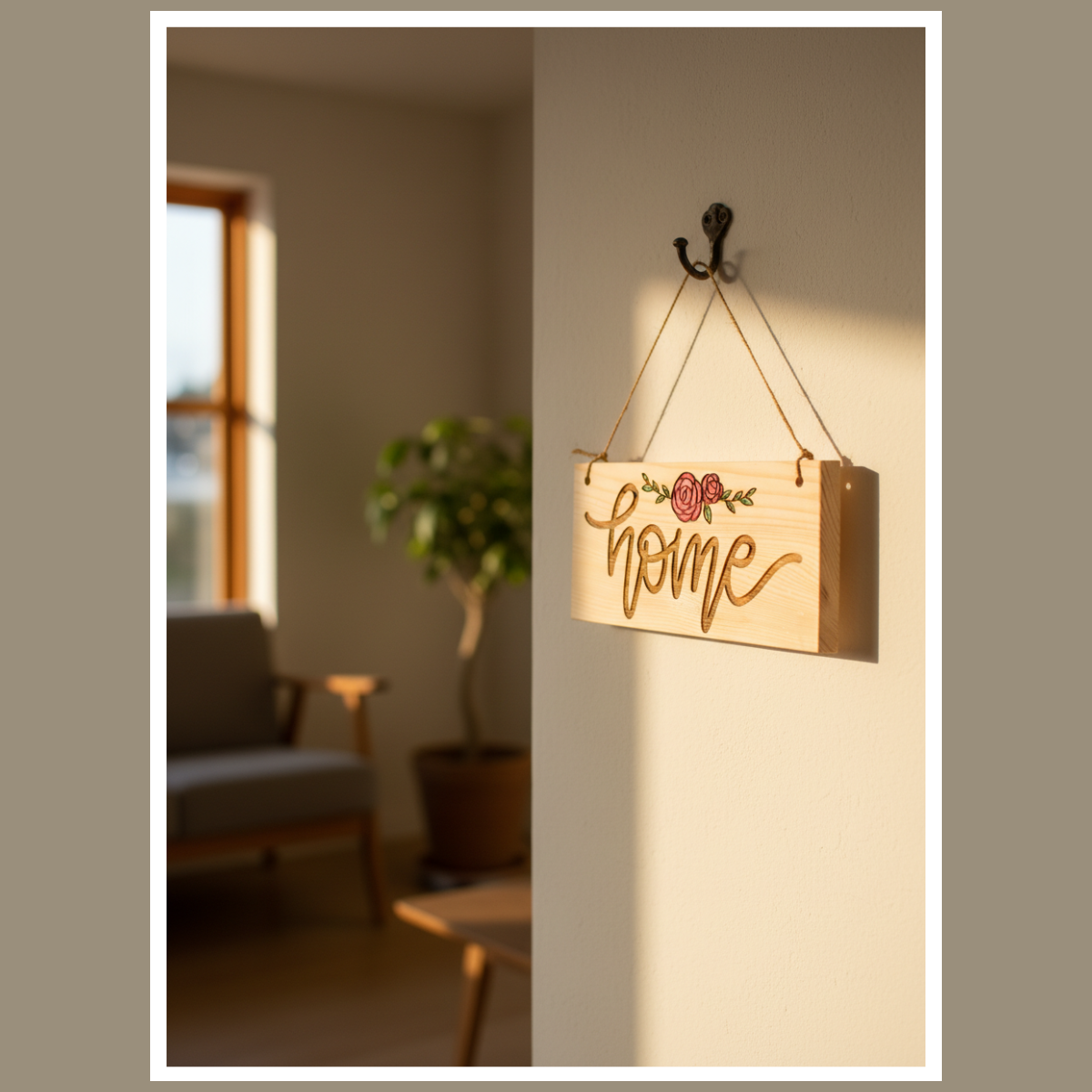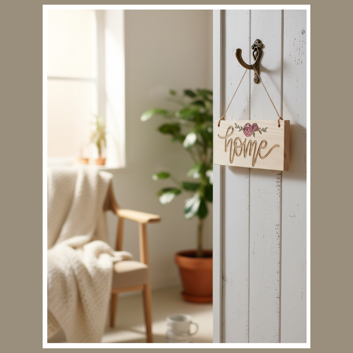 Wyróżnia ją połączenie prostego napisu „Home” z subtelnym motywem róży. Dekoracja ma sznurek do zawieszenia, dlatego prezentuje się lekko i naturalnie. Całość jest spokojna, ale przyciąga wzrok.