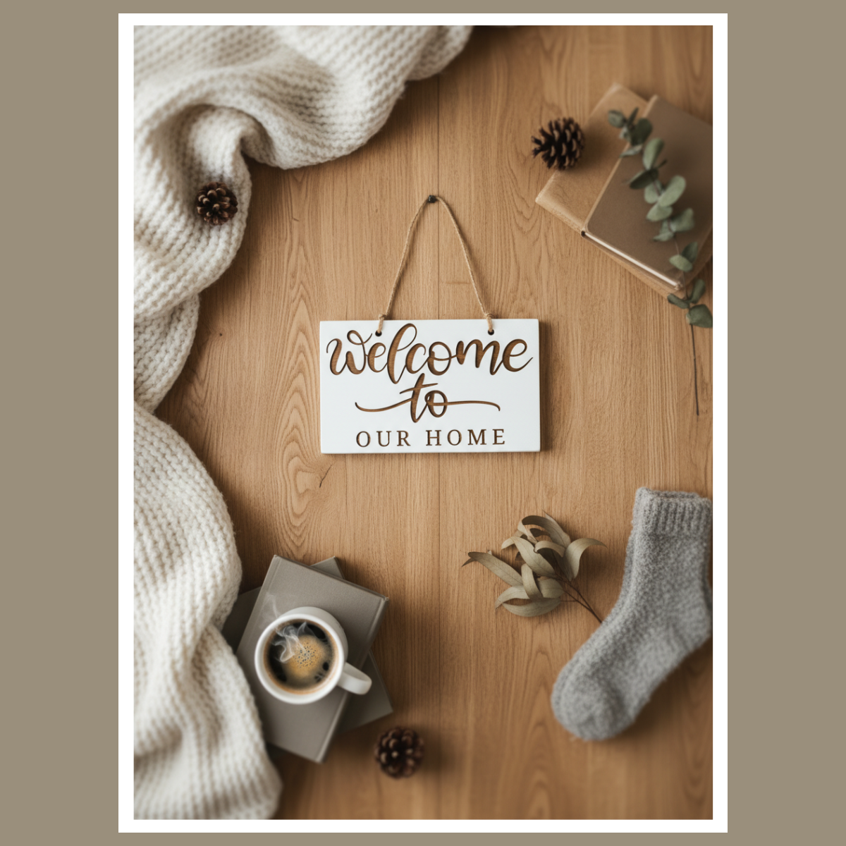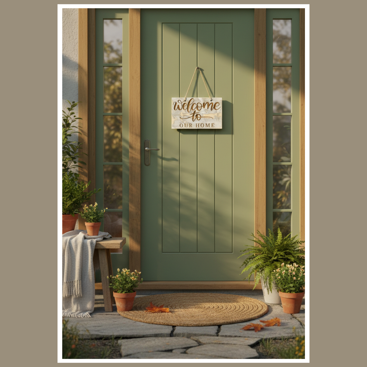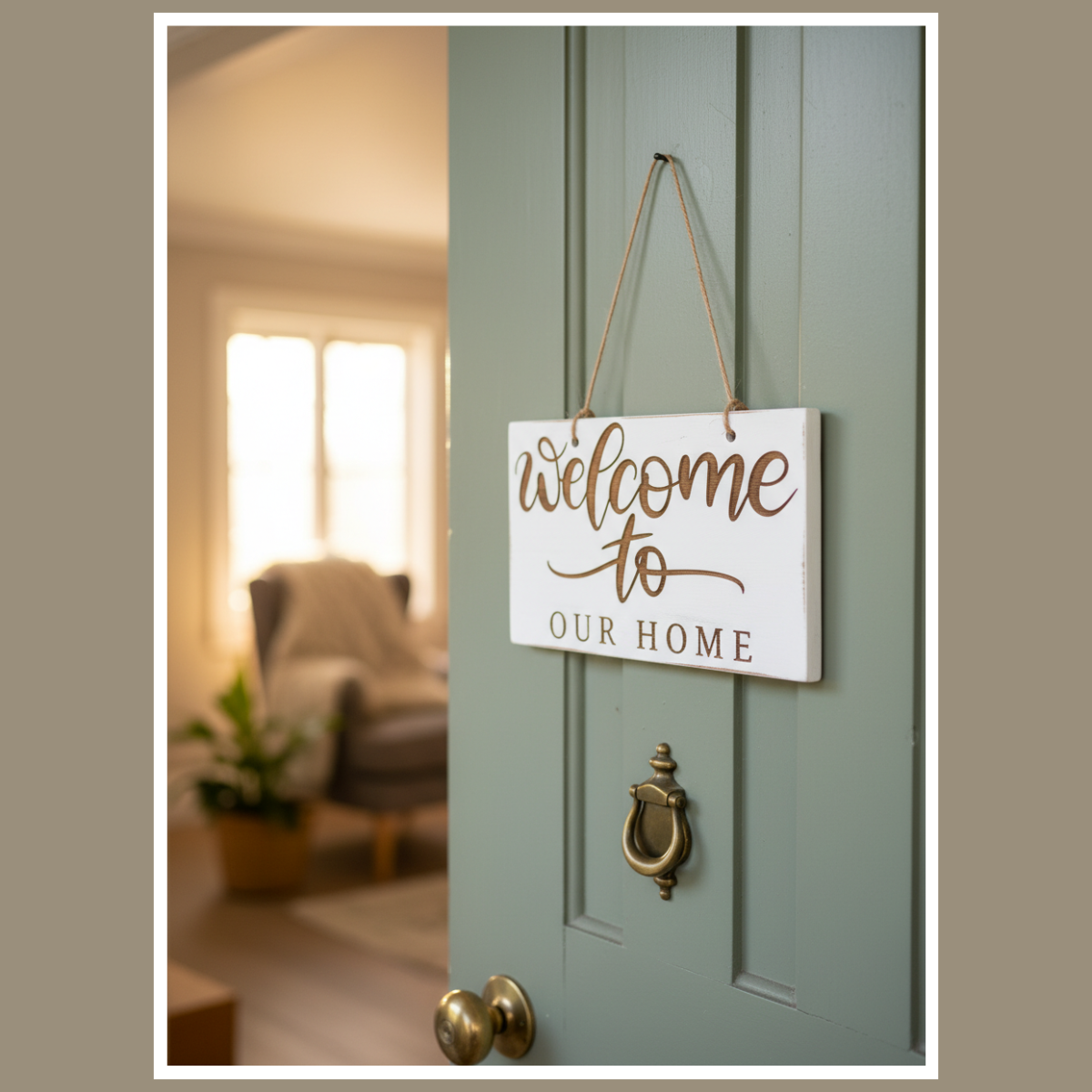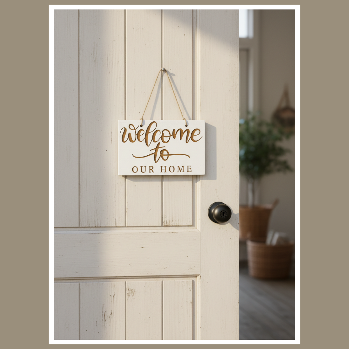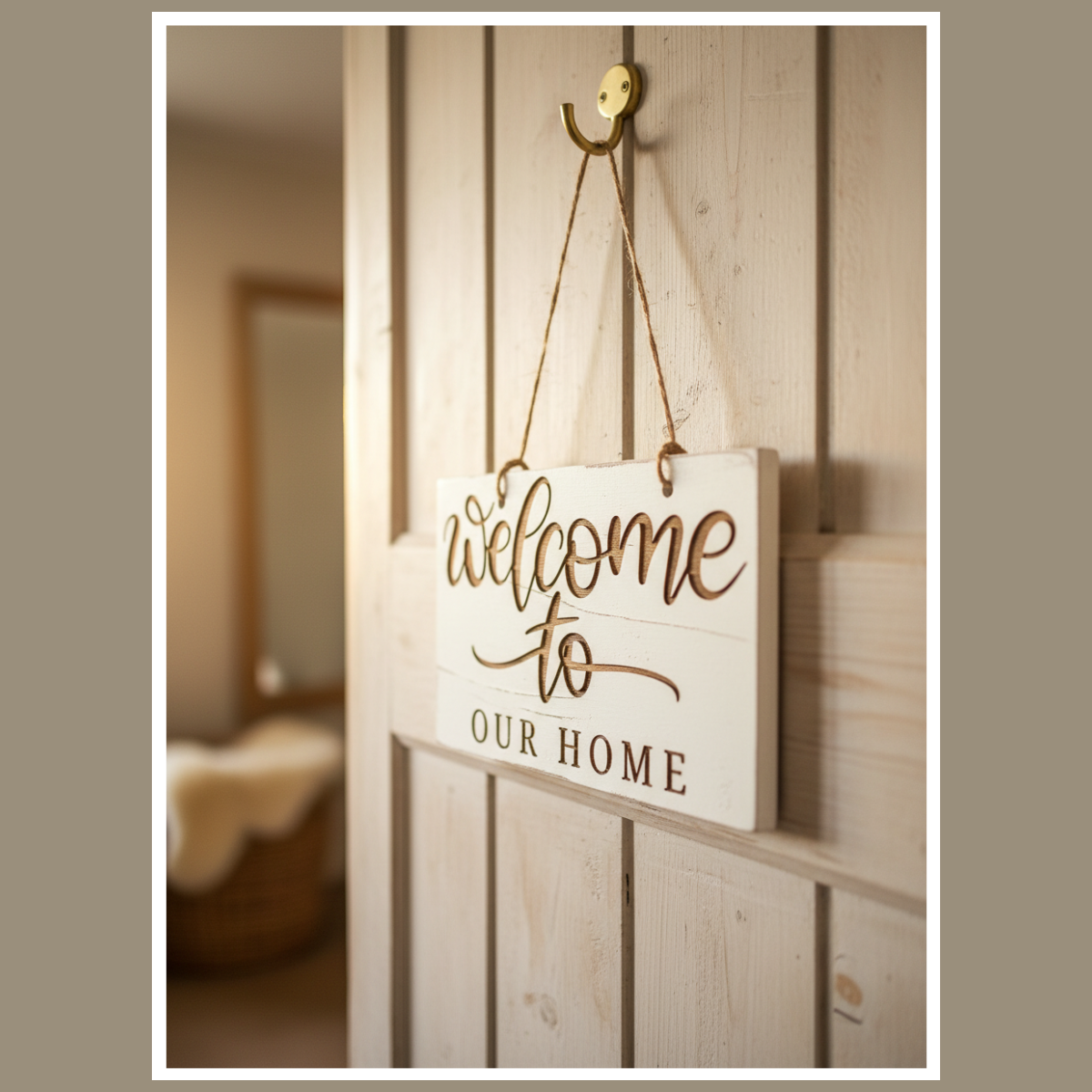 To drewniana tabliczka z grawerowanym napisem „Welcome to Our Home”. Minimalistyczna forma sprawia, że łatwo dopasujesz ją do różnych aranżacji.