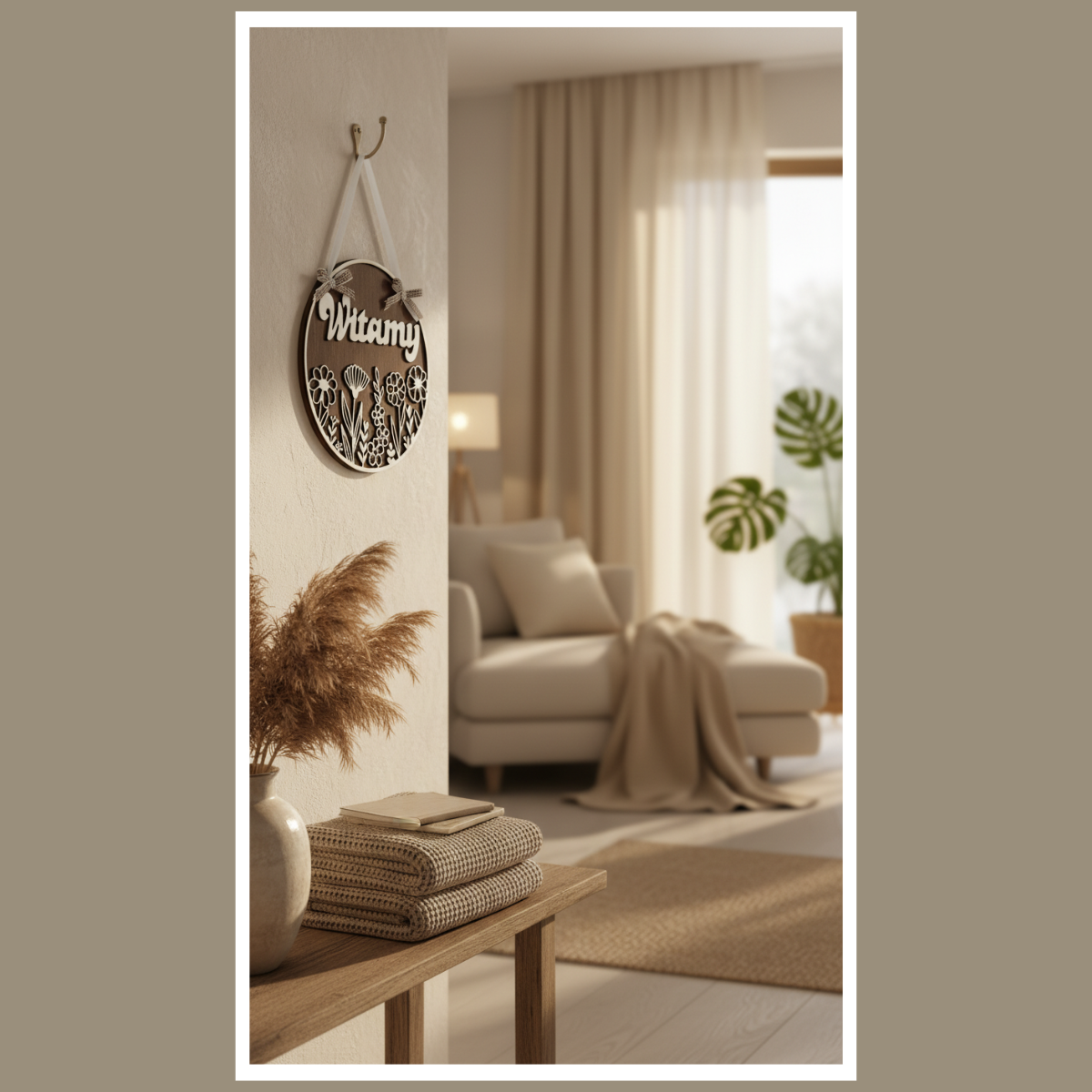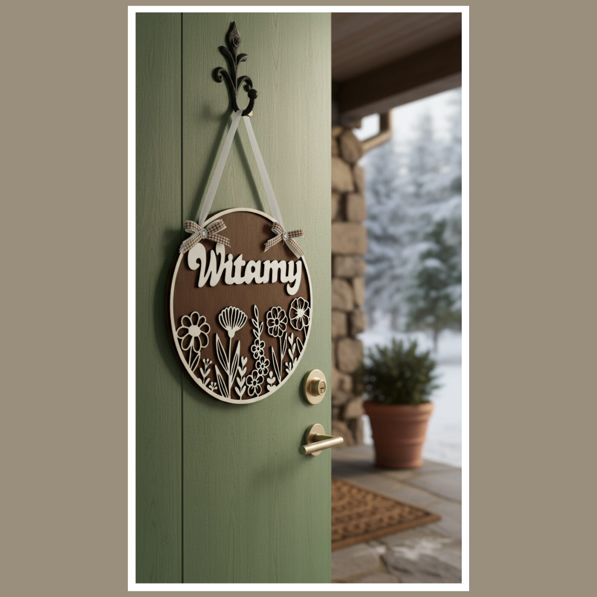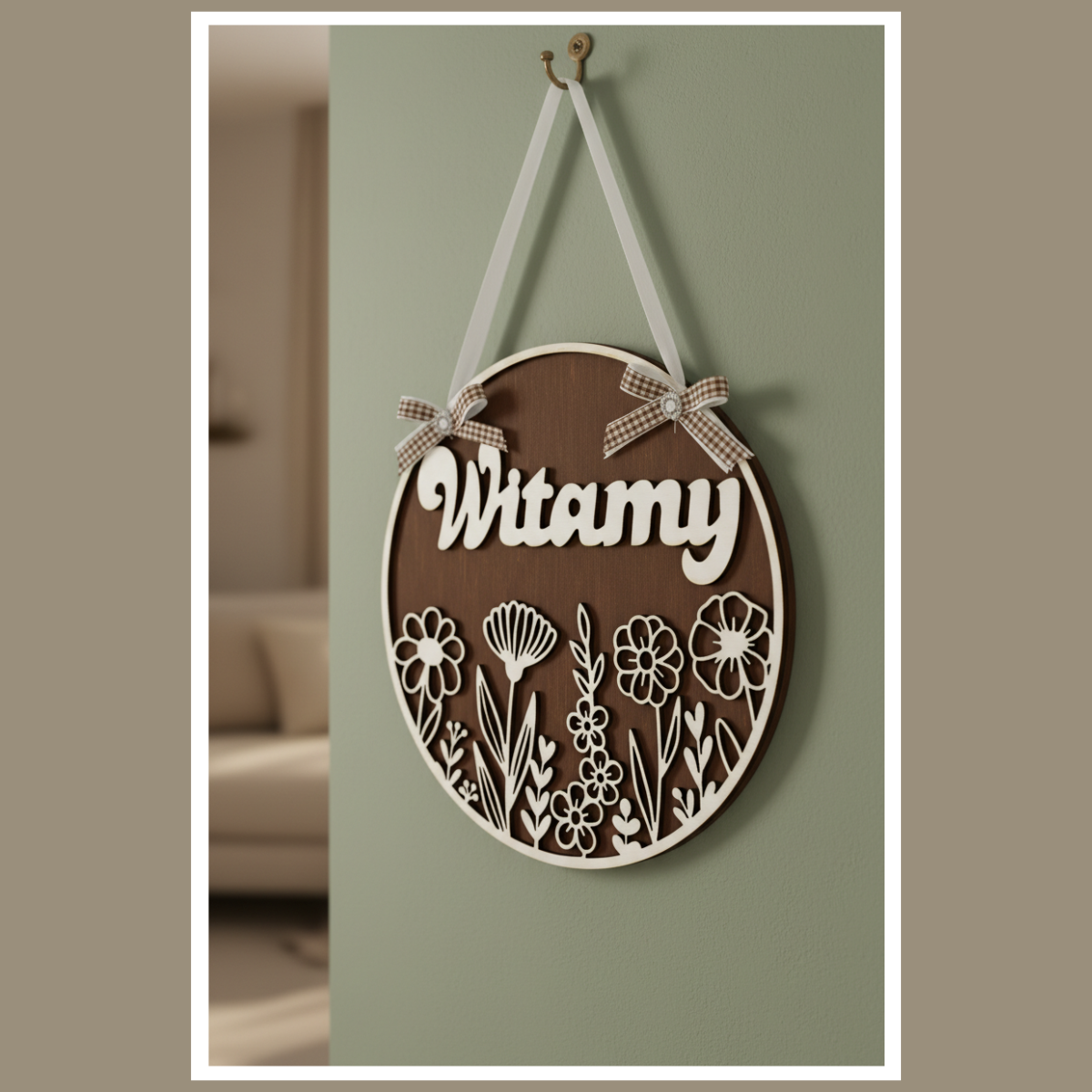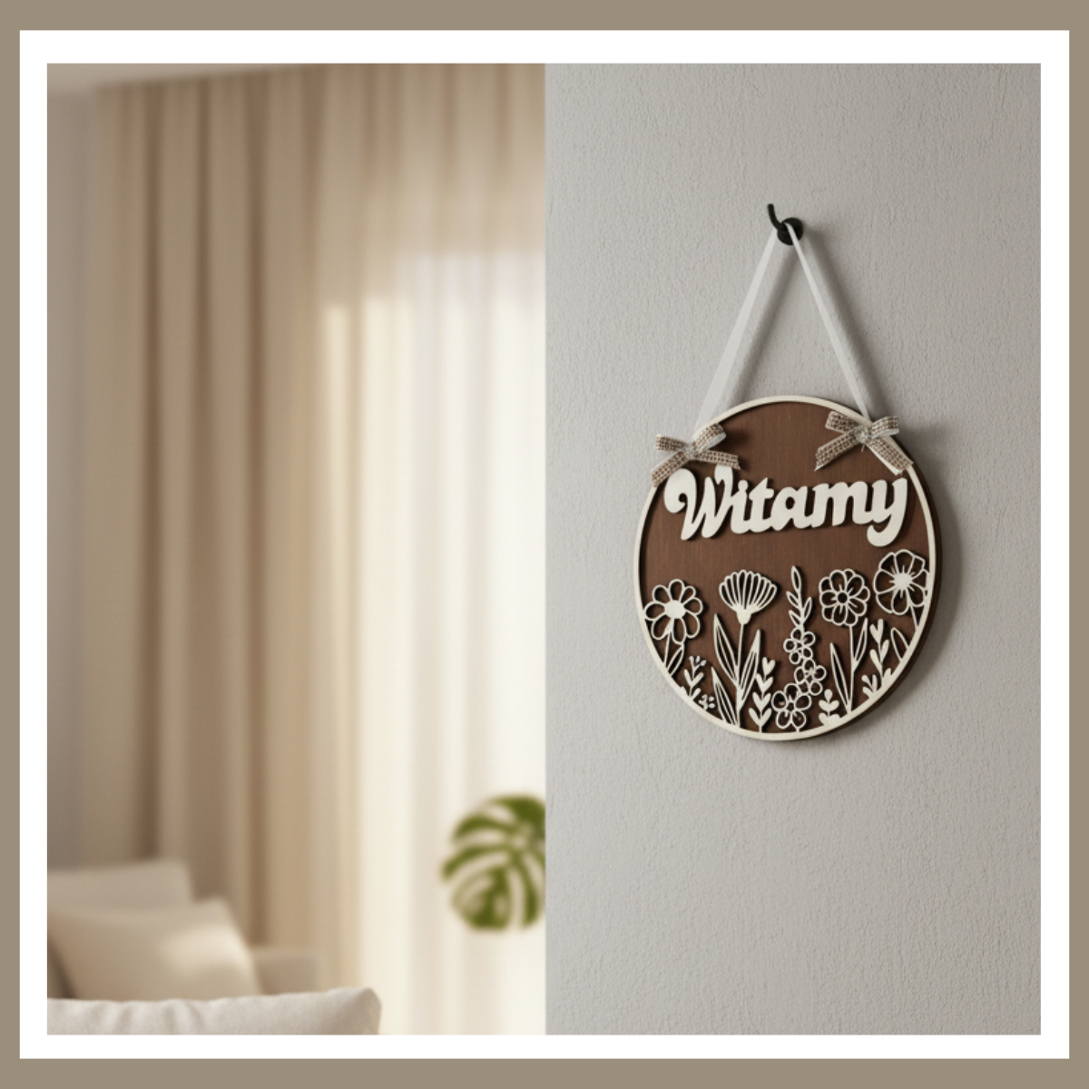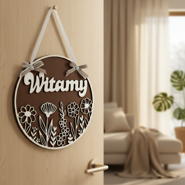 Okrągła forma wygląda nowocześnie, a przestrzenny napis nadaje tabliczce efekt „premium”. Dodatkowo kokardki ocieplają kompozycję, dlatego dekoracja pasuje zarówno do klasycznych, jak i nowoczesnych drzwi.