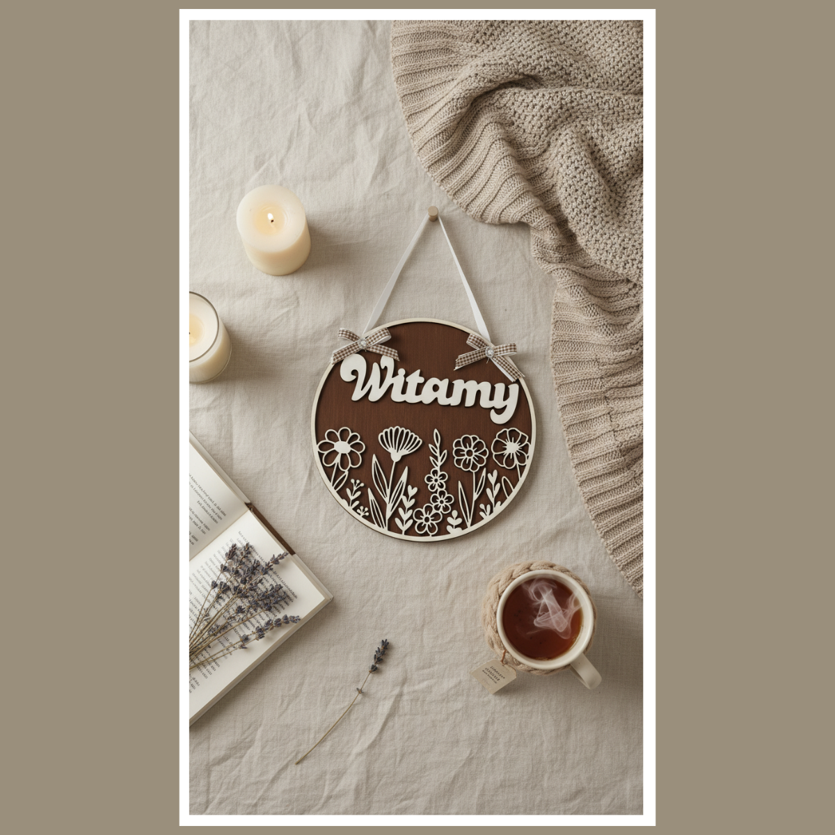 Szukasz dodatku, który od razu podkreśli charakter wejścia? Tabliczka na drzwi „Witamy” – ciemno brązowa z kwiatami to wyrazista dekoracja, która robi świetne pierwsze wrażenie. Kontrastowe, ciemno brązowe tło podkreśla napis „Witamy”, a kwiatowy wzór dodaje całości elegancji.