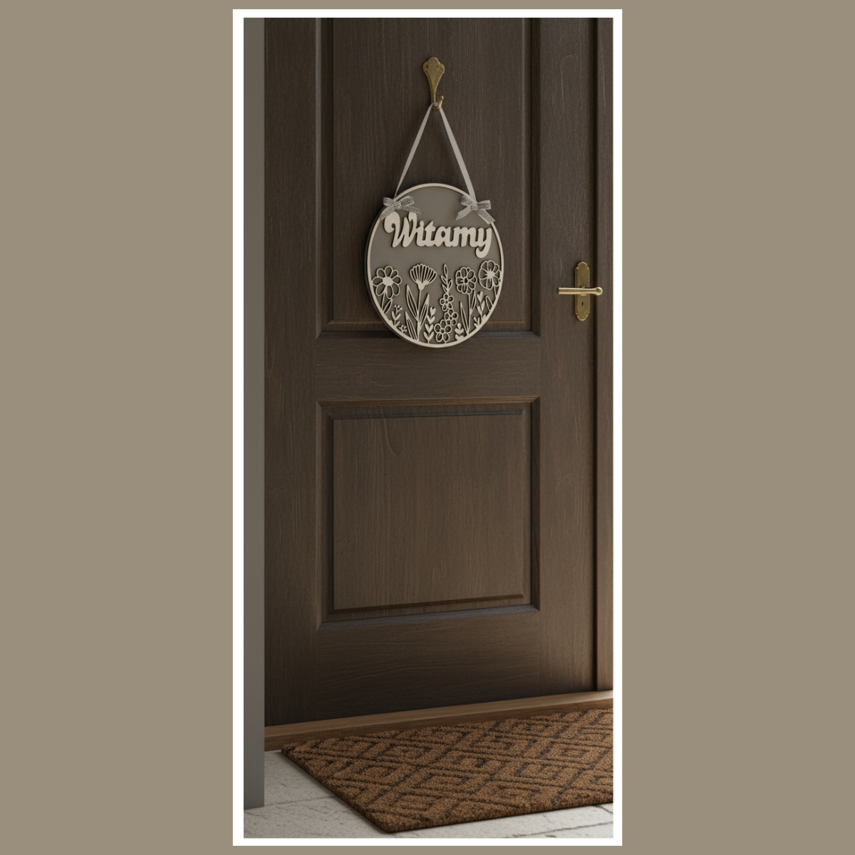 Tabliczka pięknie wygląda na drzwiach. Możesz ją też zawiesić w wiatrołapie, na tarasie albo na ścianie, jeśli chcesz podkreślić klimat wejścia do domu.